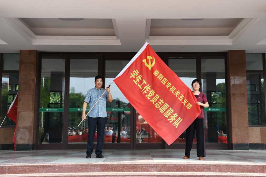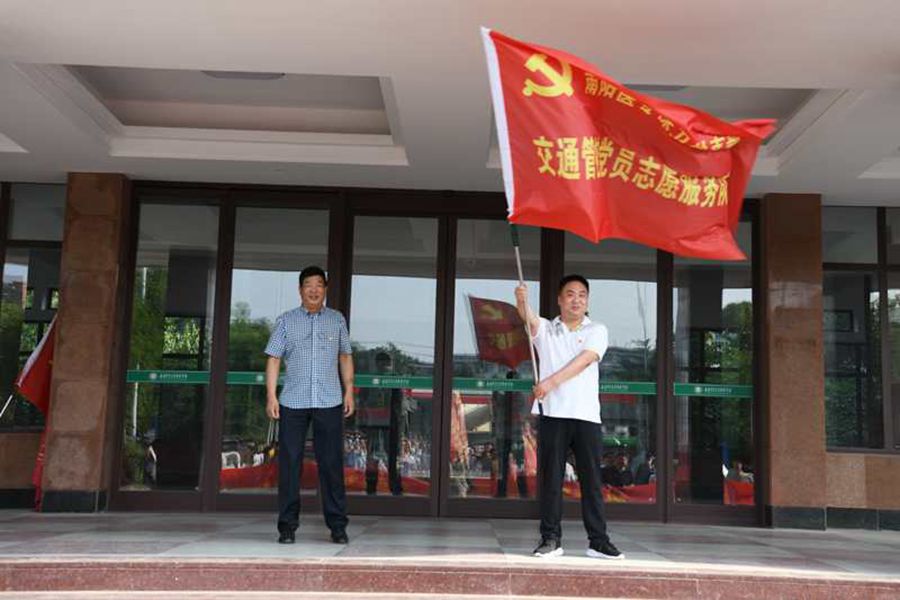 在7月6下午,机关三、五、七支部和保卫处直属支部联合举行“牢记初心使命、争当出彩先锋”主题党日活动启动仪式,党委委员、副校长张国良和郭万周分别为党员志愿服务队、车辆保障党员志愿服务队、后勤保障党员志愿服务队、学生工作党员志愿服务队、交通管控党员志愿服务队授队旗。在这次活动中,68名党员高擎志愿服务队旗,顶烈日,战酷暑,全程跟踪服务,让党旗在助考一线高高飘扬,充分发挥了党员的先进模范作用。(编审 李峰松)