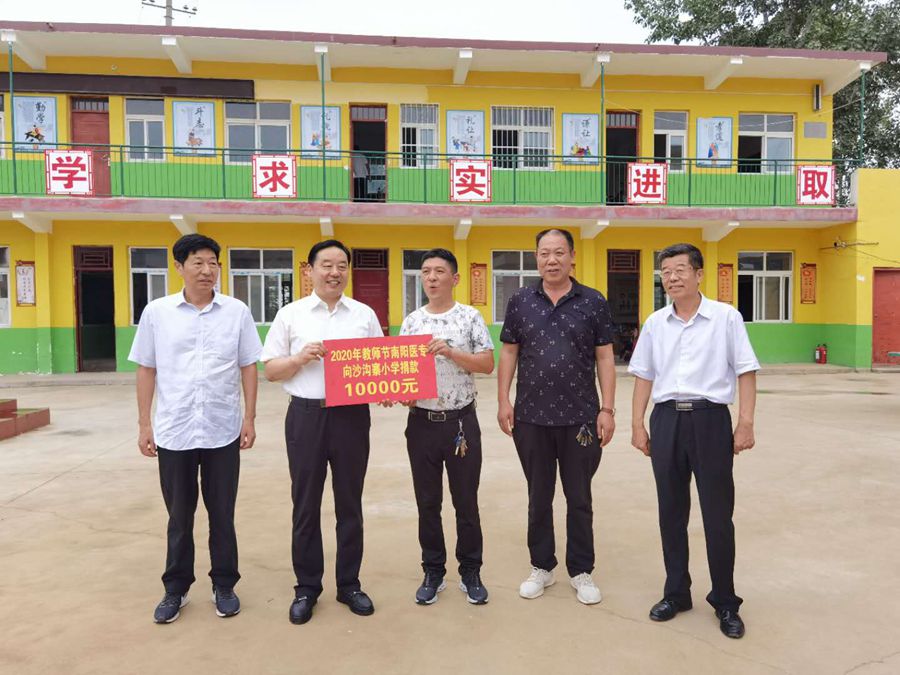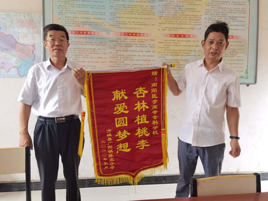 此次慰问,我校为陈庄小学和沙沟寨小学各发慰问金10000元。在陈庄小学,全书记一行听取了学校的基本情况介绍及“南阳医专梦想基金”的使用情况,该校负责人现场赠予我校“杏林植桃李、献爱圆梦想”的锦旗,感谢近年来对陈庄小学的大力支持和帮助。在沙沟寨小学,全书记一行仔细察看了校园环境、现场听取了学校发展情况介绍,深入了解了学校教育教学管理等。在交谈过程中,全书记讲到,南阳医专作为官坡岭村和沙沟寨村的帮扶单位,会充分发挥教育资源优势,将全力支持小学教育的发展,将继续为两所小学在硬件设备、校园基本建设等方面给予支持和帮助。