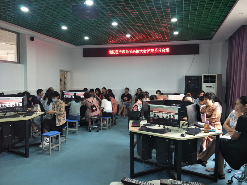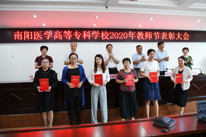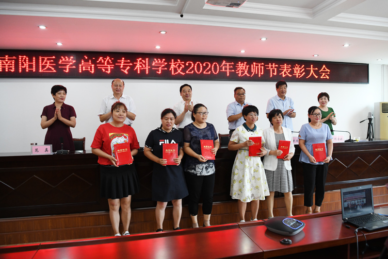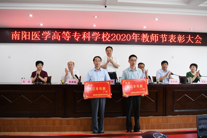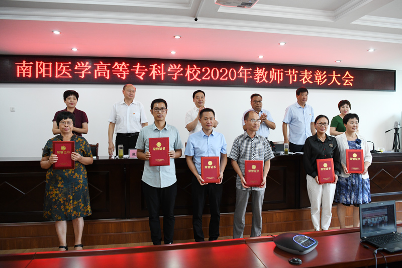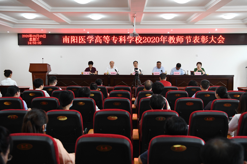 本网讯(文/行政办 毕大鹏)为庆祝第36个教师节的到来,9月9日下午3:00,学校采取线上主会场和线下分会场相结合的形式,隆重举行了2020年教师节表彰大会。大会主会场设在仲景西区1号办公楼5楼会议室,校领导全新明、逵应坤、张胜海、郭万周、范真、刘金云同志出席会议;优秀教师代表以及各相关处(室)、系(部、院)的负责同志参加会议。分会场设在各系(部、院),参加人员为全体专兼职教师、全体辅导员。其他党政和后勤教辅部门人员在各自办公室通过手机钉钉群直播进行了观看。会议由党委副书记逵应坤同志主持。