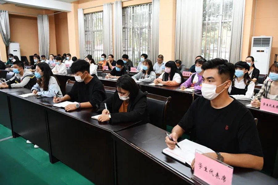 本网讯(文/党办 杨晓兵)9月20日上午,疫情防控常态化学生教育管理服务工作座谈会在南阳医专体育训练馆一楼会议室召开。党委书记全新明,副书记逵应坤,党委委员、副校长张国良、郭万周出席会议;相关部门负责人,系(部、院)负责同志,学生代表(含网格化管理员)参加会议。