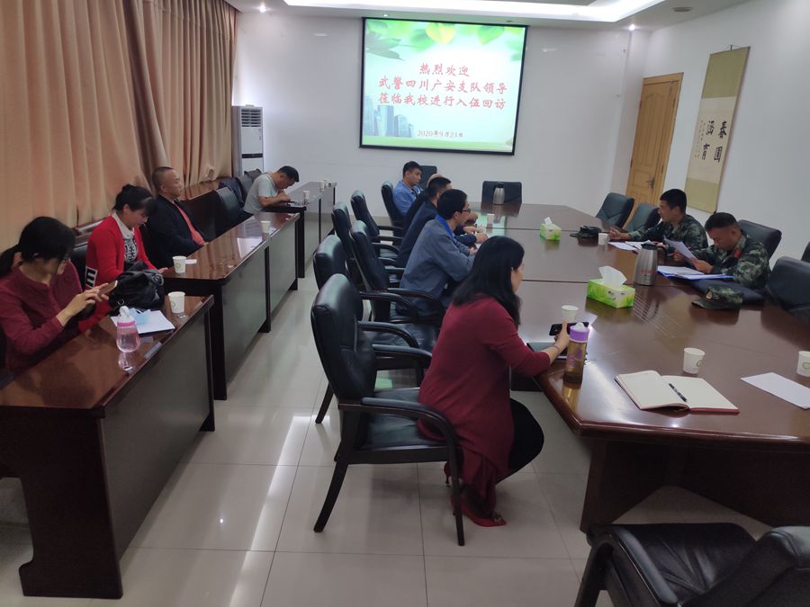 本网讯(文/校武装部 皇甫乐观)9月24日下午,武警四川广安支队领导黄鹏飞一行莅临我校进行了新兵入伍回访工作,回访会在一号办公楼二号会议室进行。参加会议的有学校武装部副部长余飞海、新兵所在系院的学工办主任、辅导员、班主任等。