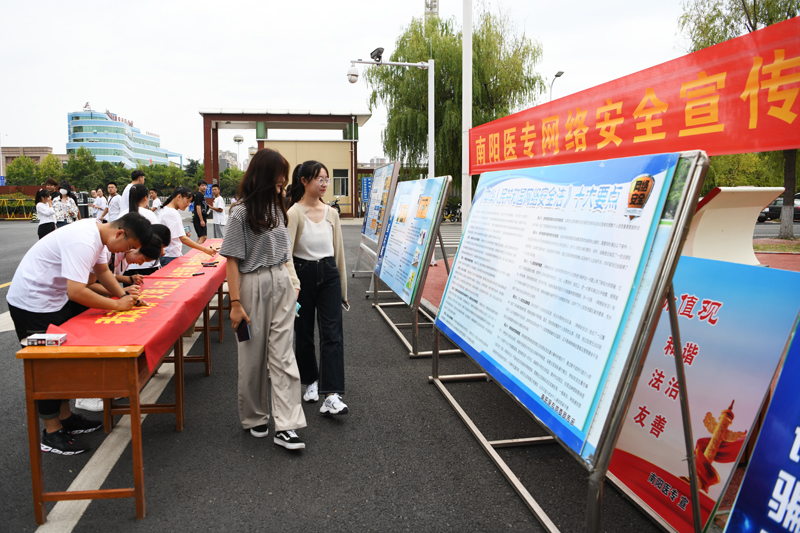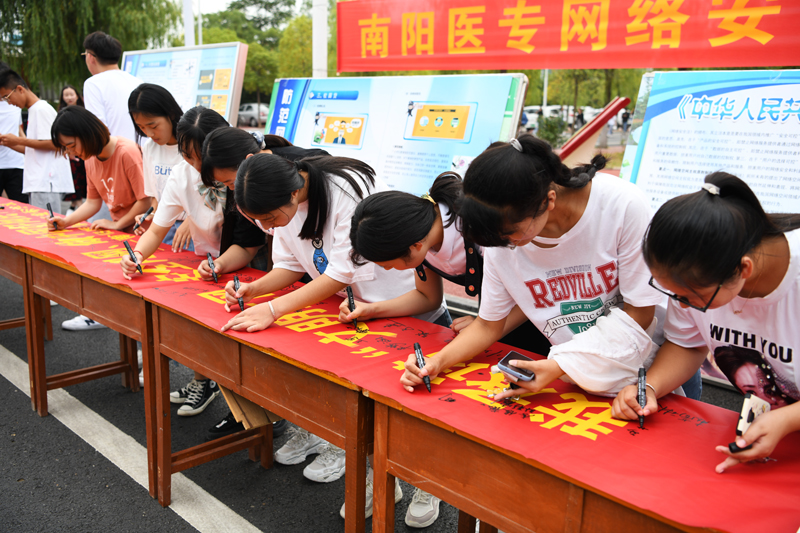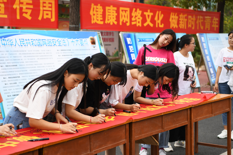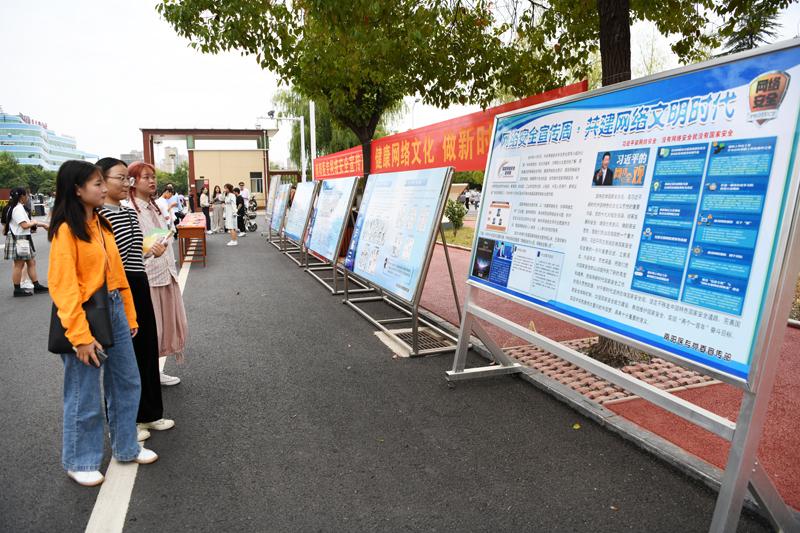 在9月16日网络安全宣传周校园日活动中,党委宣传部在校园主干道展出专题展板,图文并茂地展示了防电信诈骗、校园贷套路、电子邮件和无线网络安全使用注意事项等与大学生息息相关的内容,吸引了不少学生驻足浏览阅读。党委宣传部在宣传展板前开展主题日签名活动,同学们在校新媒体工作室成员的引导组织下,在印有“文明上网、安全用网、做中国好网民,传递青春正能量!”字样条幅上签下自己的名字,用实际行动表达维护网络安全、争做“四有好网民”的决心。