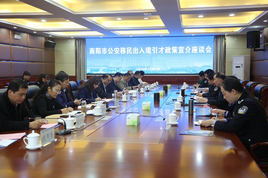 本网讯(文/外事处 周国军)11月5日下午,南阳市公安移民出入境引才政策宣介座谈会在河南工业职业技术学院召开,河南省公安厅二级警务专员、出入境管理局局长赵书乾、南阳市公安局党委委员王勇以及南阳市公安局出入境管理处、南阳市公安局仲景分局、南阳师范学院、南阳理工学院、河南工业职业技术学院、卧龙电气南阳防爆集团等单位负责领导参加会议。我校党委副书记逵应坤应邀在会议上作了题为《把握政策 热情服务 努力做好外籍人员管理服务工作》的典型发言。
