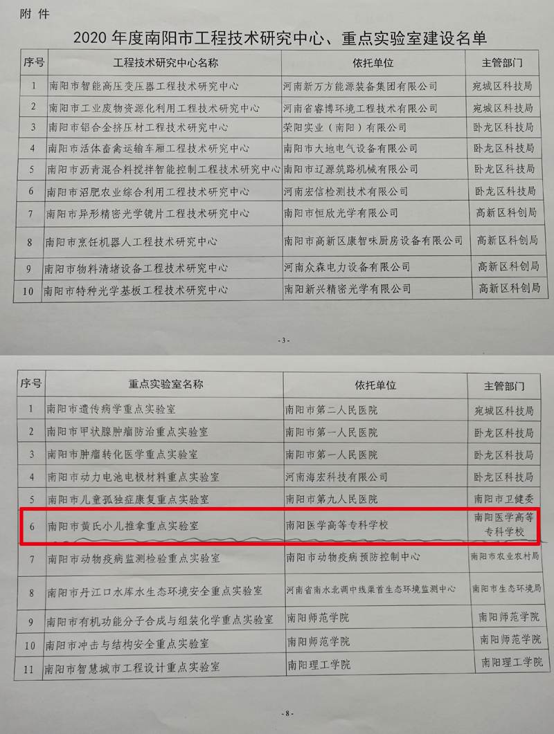 本网讯(文/针灸骨伤系 李明哲)近日,南阳市科技局发布了《关于同意河南新万方能源装备集团有限公司等73家单位建设南阳市工程技术研究中心、重点实验室的通知》。我校“黄氏小儿推拿”南阳市重点实验室获批建设运行。