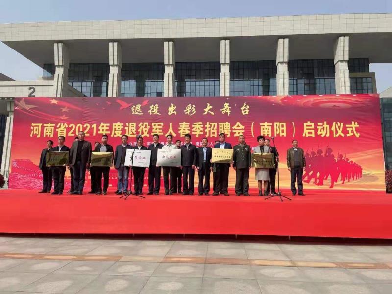 本网讯(文/继续教育学院 赵红伟)2021年3月30日,由河南省退役军人事务厅和南阳市人民政府主办的河南省2021年度退役军人春季招聘会(南阳)暨《退役军人保障法》系列宣传活动”在市范蠡东路市民服务中心广场成功举办。省退役军人事务厅副厅长姚国宝同志、省人社厅二级巡视员孙银正同志、市政府副市长石秀田同志、南阳军分区副司令杨保军同志等有关省市部门领导参加了启动仪式。