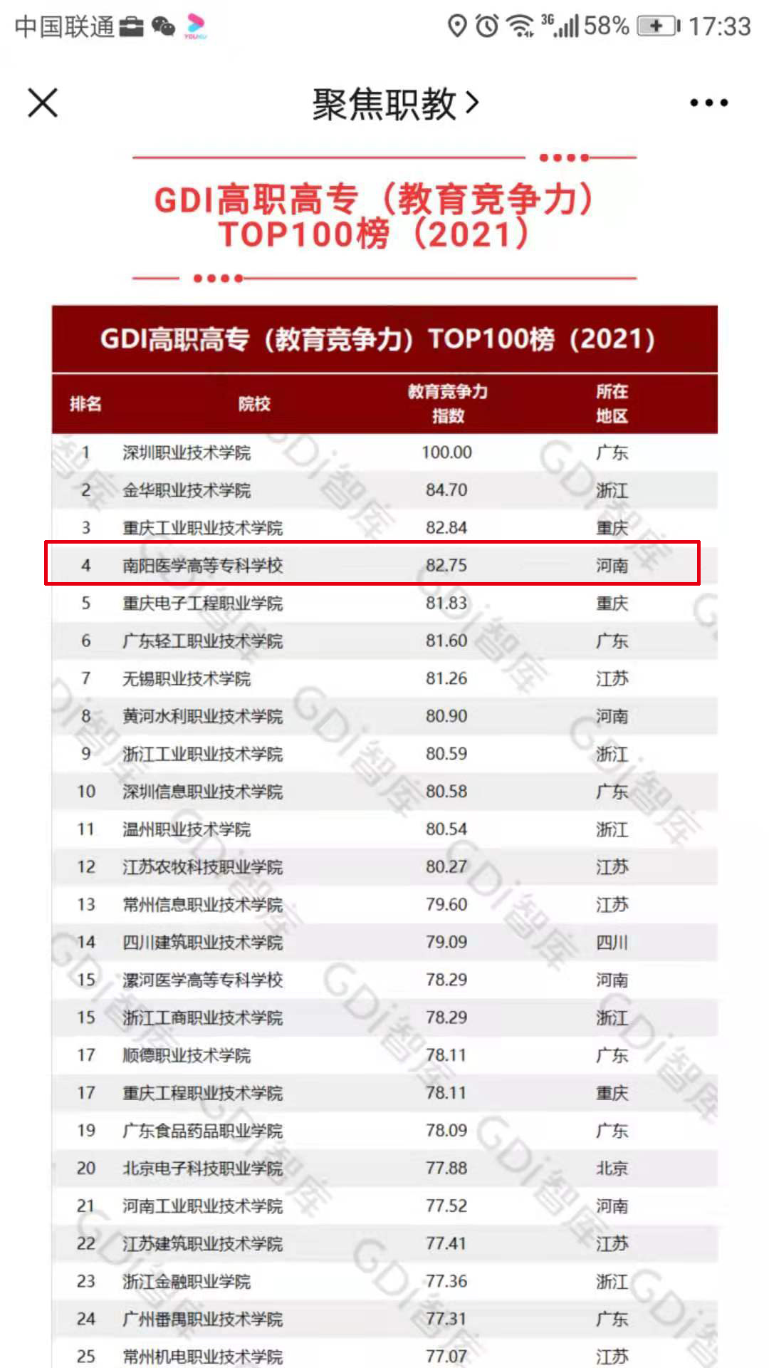 在“GDI高职高专排行TOP1000榜(2021)”基础上,GDI智库推出“GDI高职高专(公办)TOP300榜(2021)”。从教育竞争力指数来看,威客电竞·(中国)VK GAMING,以82.75的分数排名全国第四。
