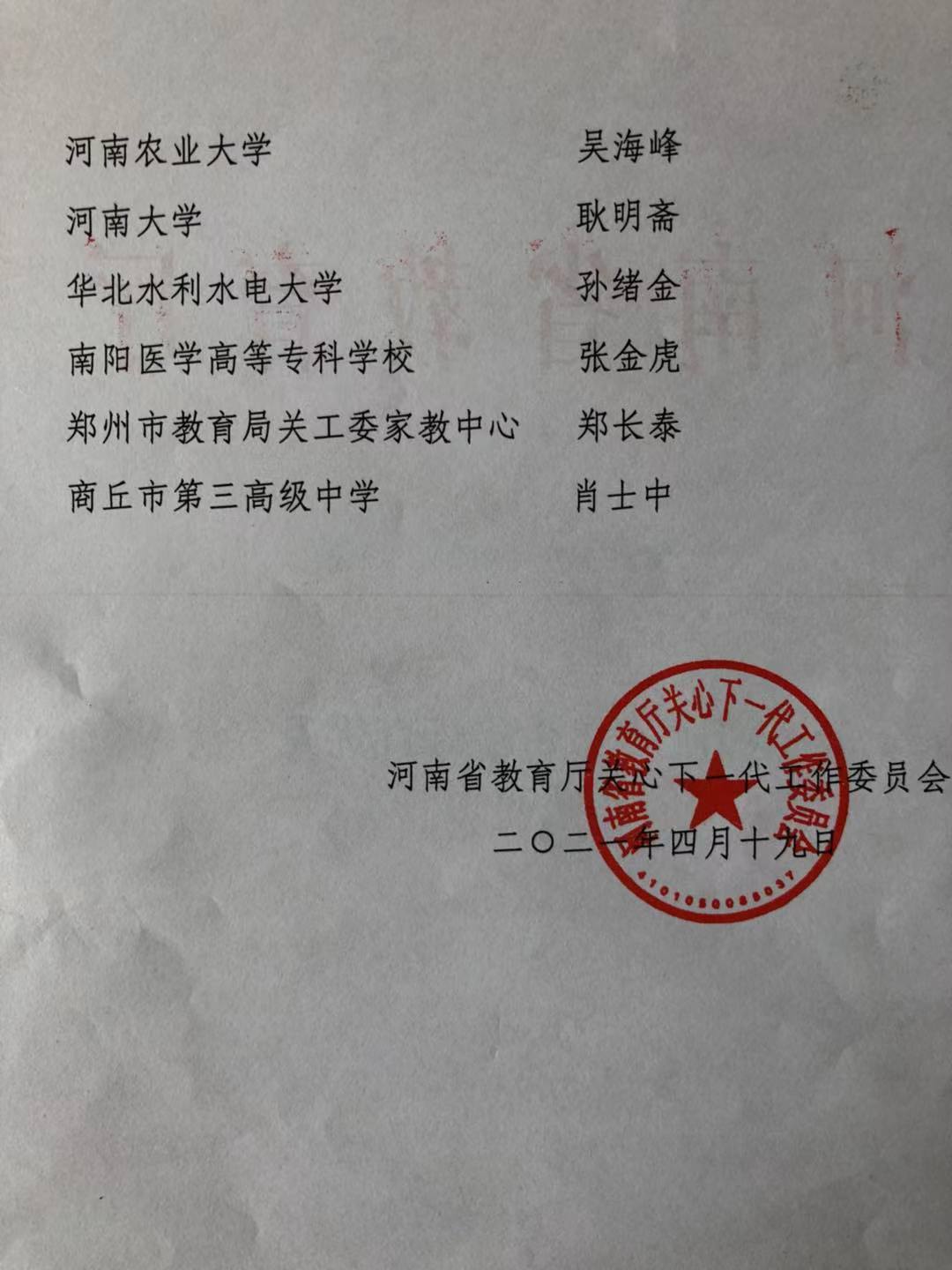 本网讯(文/离退处 朱迪)《河南省教育厅关于公布河南省青少年德育优秀宣讲专家的通知》(豫教关字[2021]11号)发布,南阳医专关心下一代工作委员会常务副主任张金虎被确定为第三批河南省青少年德育优秀宣讲专家。