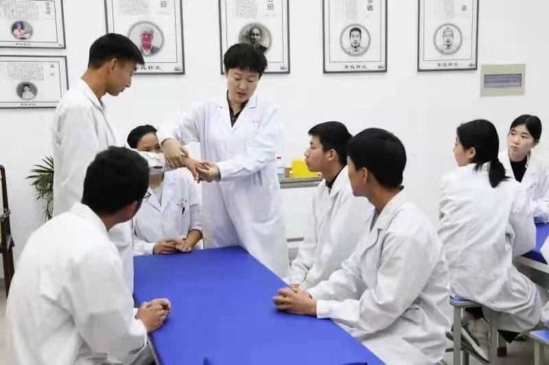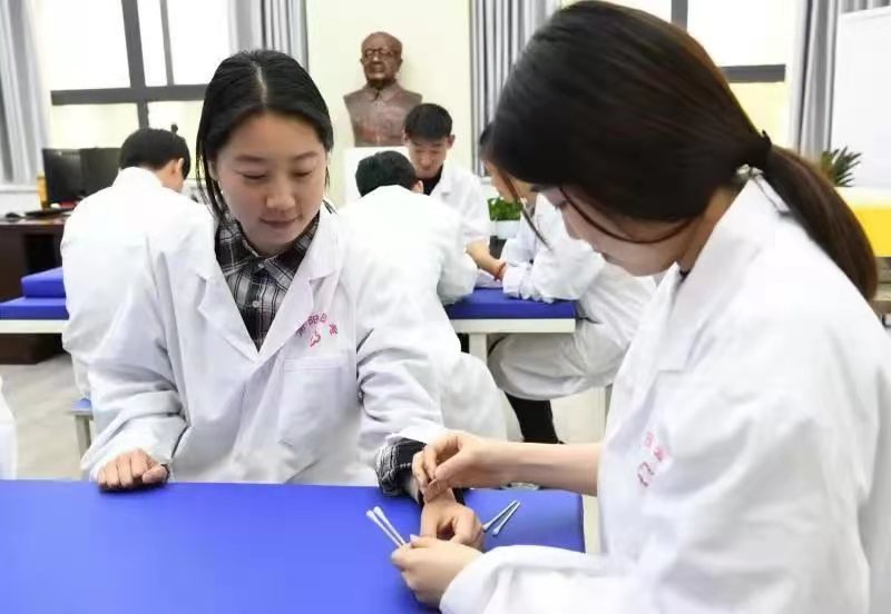 在威客电竞·(中国)VK GAMING,,当地李氏针灸流派的第17代传人潘华教授带领学生进行腧穴定位和毫针刺法的实训课程。