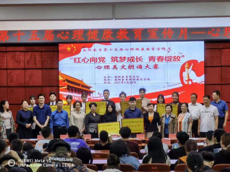 本网讯(文/国际教育学院 李冰)5月20日下午,由学生处主办、国际教育学院承办的南阳医专第十五届心理健康教育宣传月“红心向党,筑梦成长,青春绽放”心理美文诵读比赛决赛在仲景西区图书馆报告厅举行。校党委委员、副校长郭万周,学生处处长梁顺平及各系(部、院)书记、副书记、学工办主任、辅导员心理专干及学生代表等200余人参加活动。
