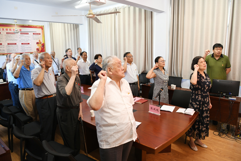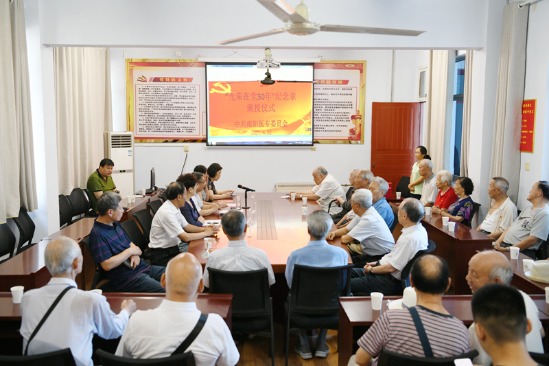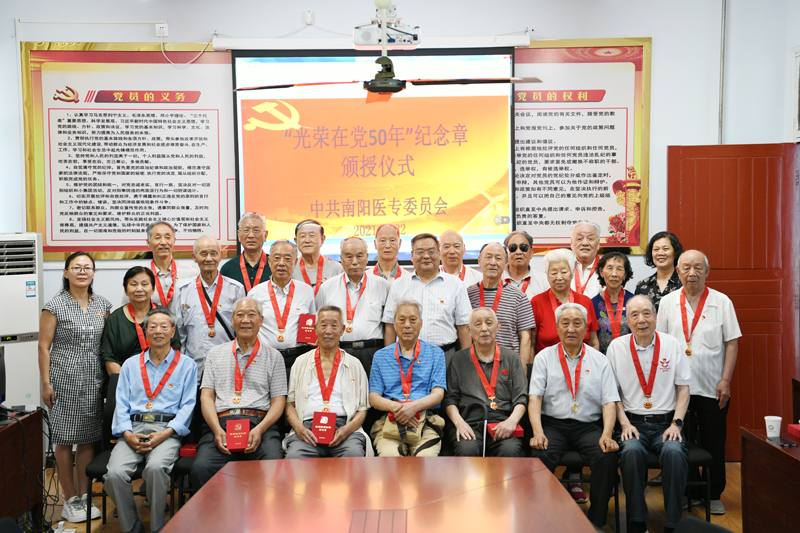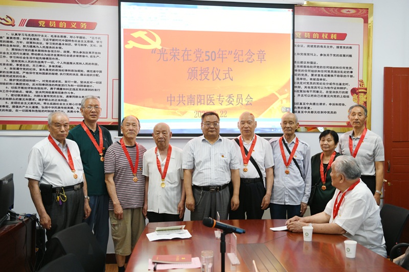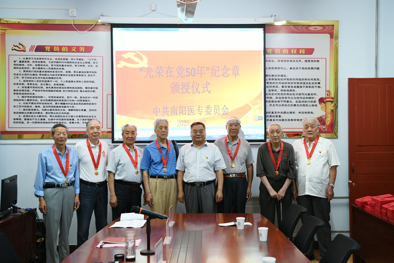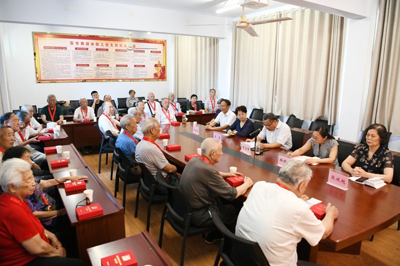 本网讯(文/离退处 艾静)为庆祝中国共产党成立100周年,推进党史学习教育走深走实,进一步增强党员的荣誉感、归属感和使命感,6月22日上午,我校在汉江路离退休职工党员活动室举行“光荣在党50年”纪念章颁授仪式。出席此次会议的有党委副书记逵应坤、“光荣在党50年”纪念章获得者代表、组织部、党委办、宣传部、离退处的同志们。