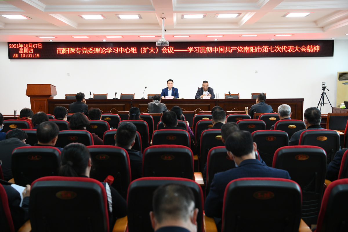 本网讯(文/宣传部 潘晓红)10月7日上午,学校召开党委理论学习中心组(扩大)集体学习会,传达学习南阳市第七次党代会精神,部署贯彻落实工作。校领导班子成员、中层领导干部参加会议,会议由党委副书记逵应坤主持。