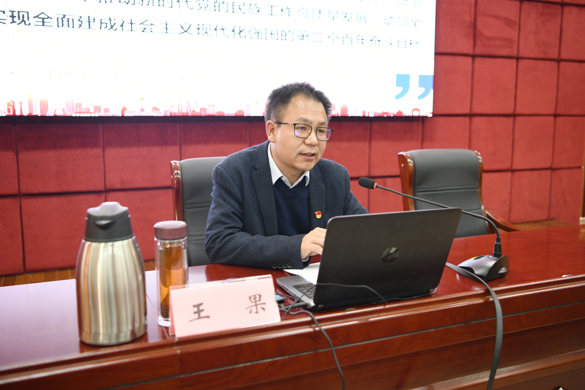 会上,王果以《新时代铸牢中华民族共同体意识的深刻内涵》为题,从新时代铸牢中华民族共同体意识提出的时代背景、新时代铸牢中华民族共同体意识内容及意义、新时代铸牢中华民族共同体意识的实践途径等三个方面进行系统深入的阐释,对做好学校民族团结进步教育常态化工作具有重要的指导意义。