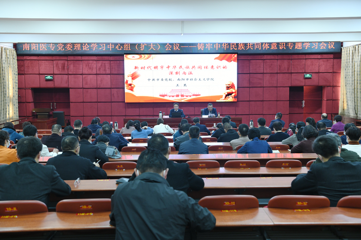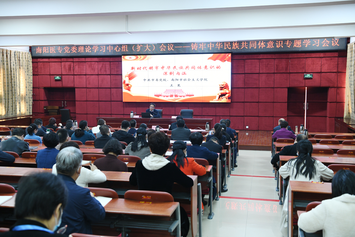 本网讯(文/宣传部 潘晓红)11 月3 日下午,学校召开党委理论学习中心组(扩大)会议,特邀中共南阳市委党校、南阳市社会主义学院统战理论教研部王果教授作铸牢中华民族共同体意识专题辅导。学校党委理论学习中心组成员、中层正职和主持工作的副职干部、思政课教师等参加会议,会议由党委副书记逵应坤主持。