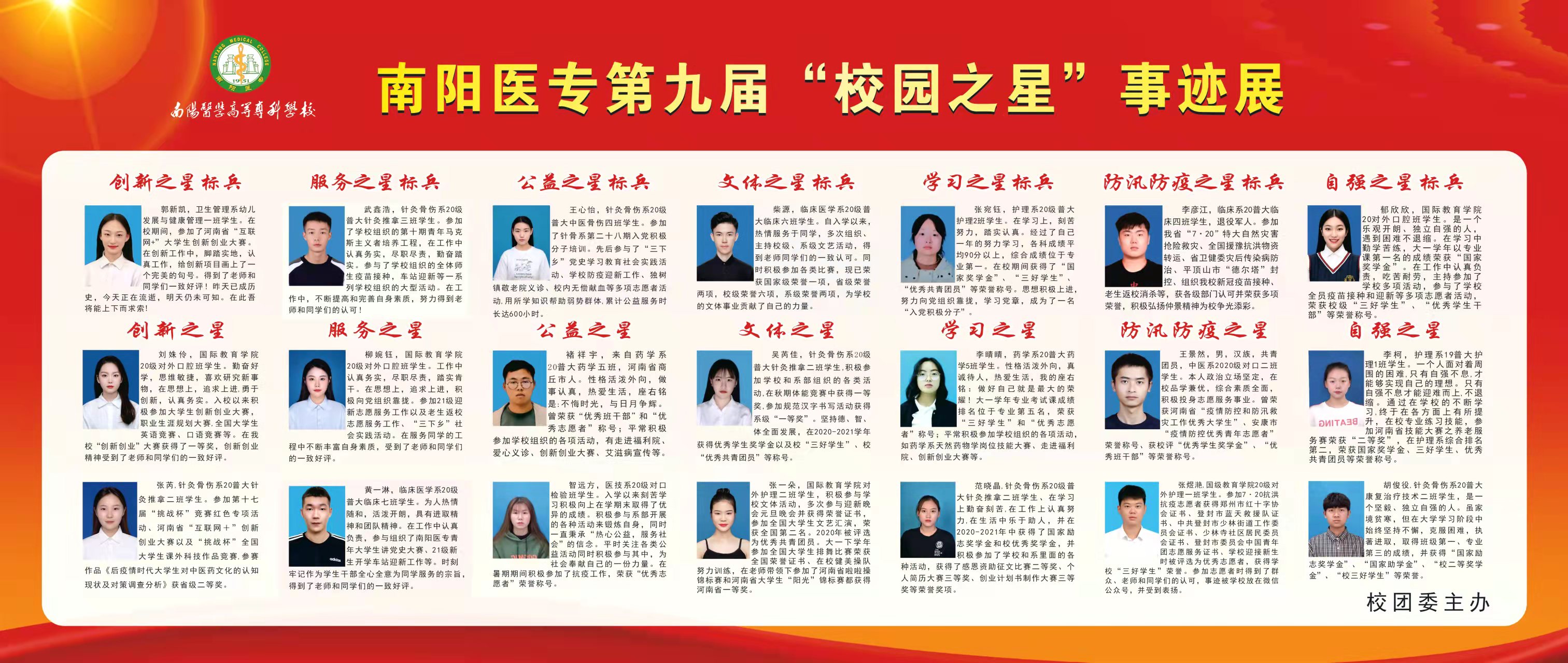 本网讯(文/校团委 古婵婵)为充分展示我校青年学生的精神风貌,挖掘先进典型,发挥榜样模范的示范带动作用,激励广大学生向榜样学习,营造良好学风、校风,构建和谐校园,2021年11月校团委在全校范围内开展了南阳医专第九届“校园之星”评选活动。