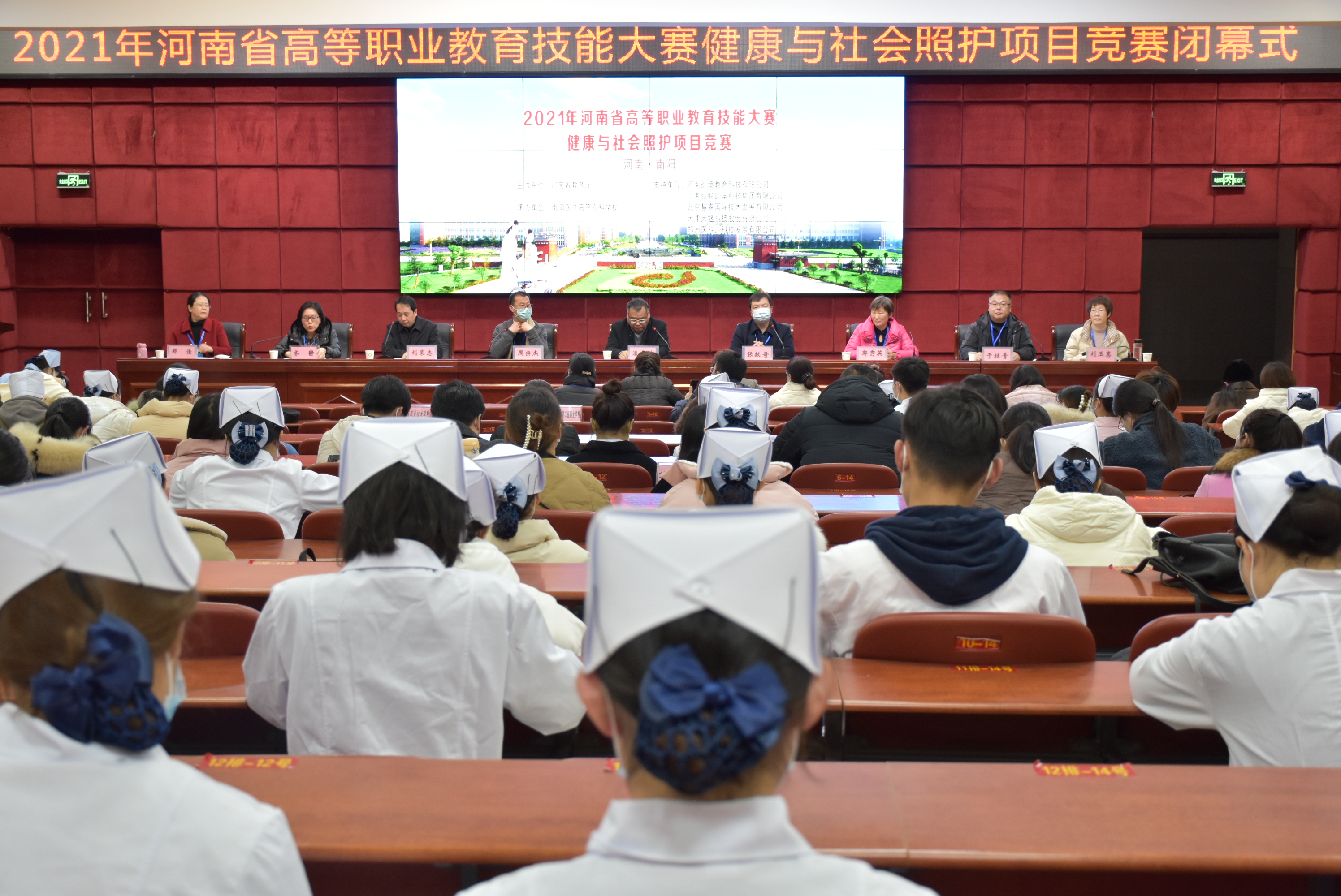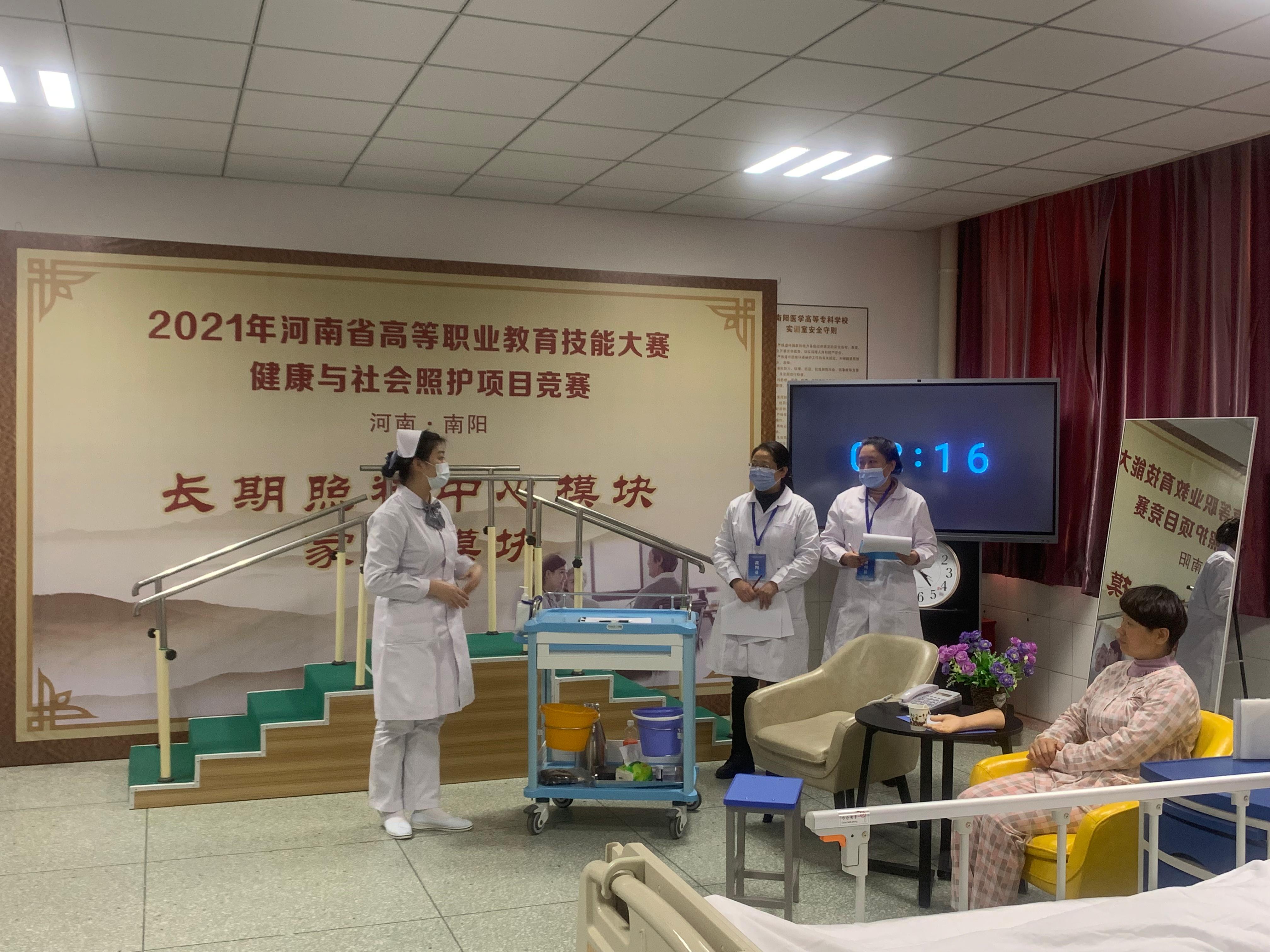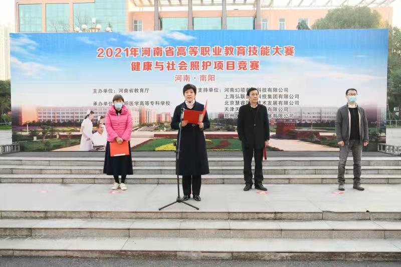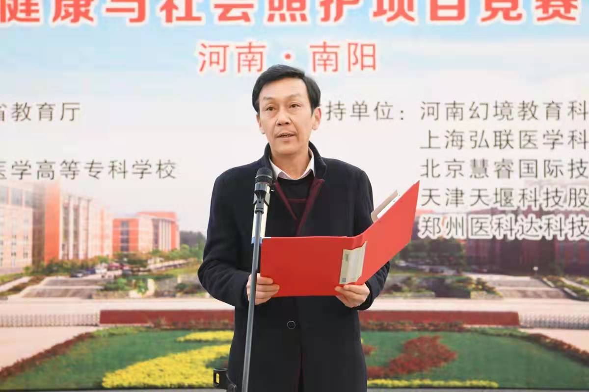 本网讯(文/护理系 李明哲)12月19日至12月20日,由河南省教育厅主办的2021年河南省高等职业教育技能大赛健康与社会照护项目竞赛在我校成功举办,来自全省的19所高职院校代表队参加了本次比赛。12月19日上午,大赛举行了开幕式,南阳医专校长王立义致欢迎词,大赛裁判长、首钢工学院护理学院前院长郭秀英同志代表全体裁判宣誓。南阳医专副校长范真主持开幕式。