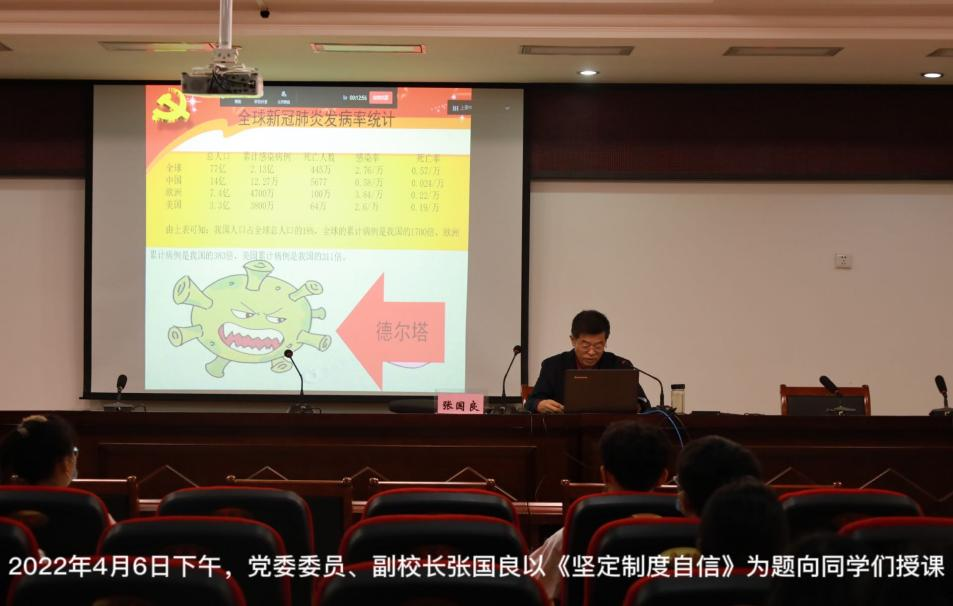 党委委员、副校长张国良以《坚定制度自信》为题,通过举例论证,用中西方面对新冠肺炎疫情采取不同举措的鲜明对比体现出中国特色社会主义制度的巨大优越性,进一步坚定了广大党员发展对象向党组织积极靠拢的理想信念。