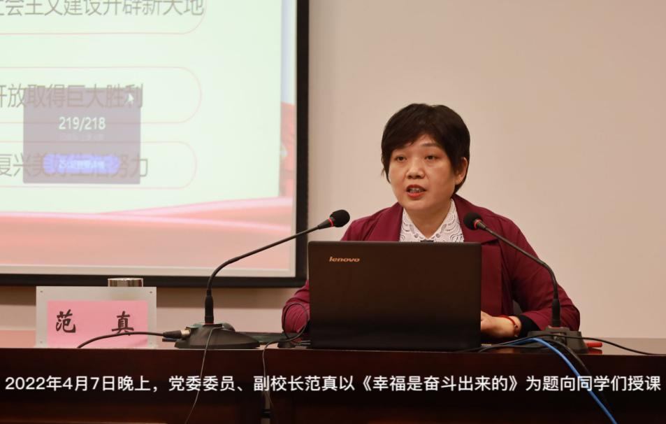 党委委员、副校长范真以《幸福是奋斗出来的》为题,激励本次参加培训的发展对象、入党积极分子们从自身做起,从生活、学习中的点滴入手,做新时代的奋斗者,为民族复兴美好生活努力,做精神富足、懂得幸福的人。