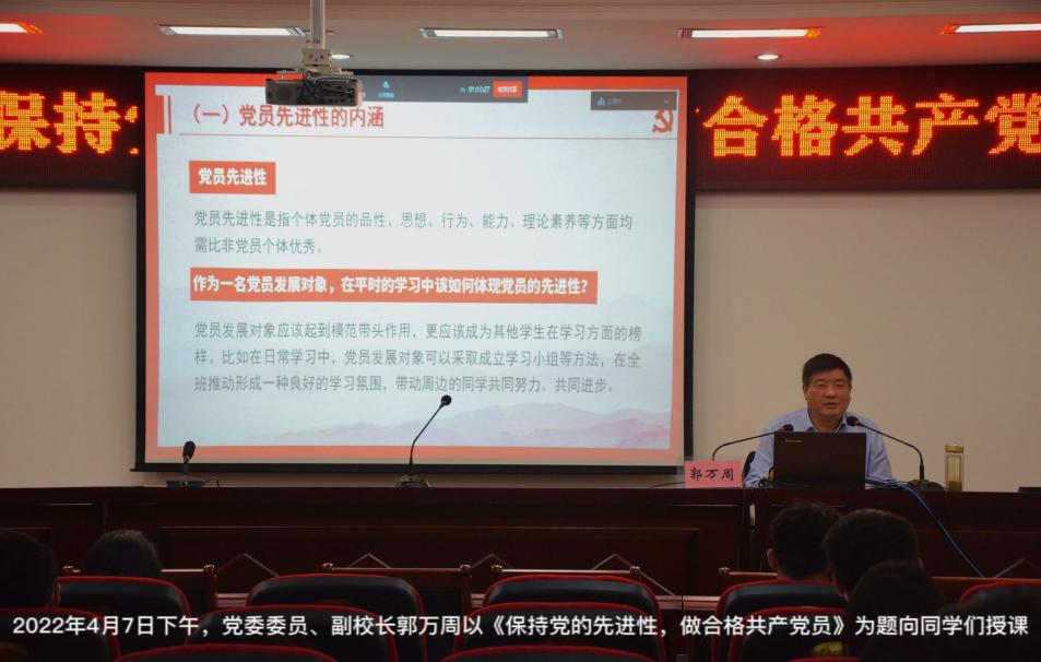 党委委员、副校长郭万周以《保持党的先进性,做合格共产党员》为题,结合生活中具体事例,深入浅出阐述了在新时代背景下,做合格共产党员的要求,深受学子欢迎。
