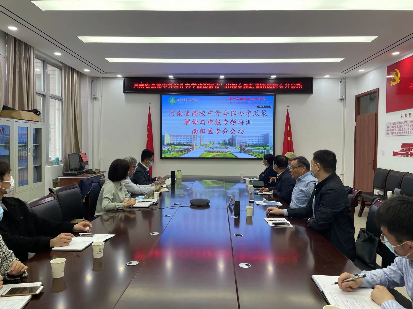 本网讯(文/对外交流合作处 夏灵果)4月28日,河南省高校中外合作办学政策解读与申报专题培训通过“腾讯会议”举办,会议由省教育厅对外合作与交流处处长、河南省教育国际交流协会秘书长王华星主持,南阳医专分会场设在3号教学楼423会议室,党委副书记逵应坤出席,对外交流合作处、国际教育学院、质量管理办公室、教务处、计财处、法制办等部门线上参加。