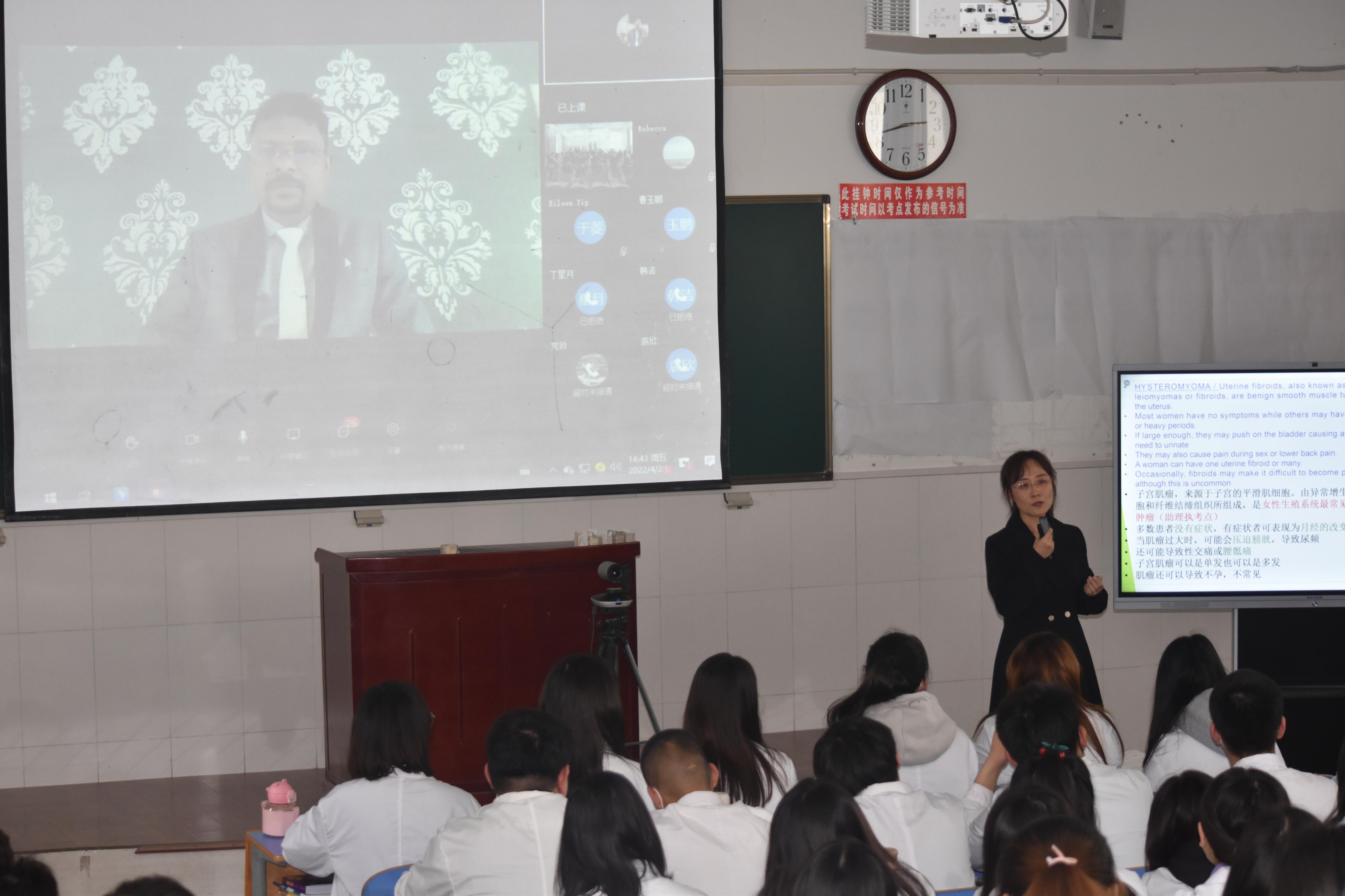 本次课授课主题为《子宫肌瘤》,授课内容由中、美双方教师共同备课,授课时外教Ravi线上进行远程钉钉在线教学,邓琳琳老师线下现场教学。课上,Ravi博士详细讲解了子宫肌瘤的概念、病因、发病机制、分类等内容,外教每讲完一个知识点,邓老师都会适时进行总结引导,对中外教材差异进行对比,加入随堂测试环节,引导学生积极参与课堂,并对本次课临床助理执业医师考试要点进行讲解。