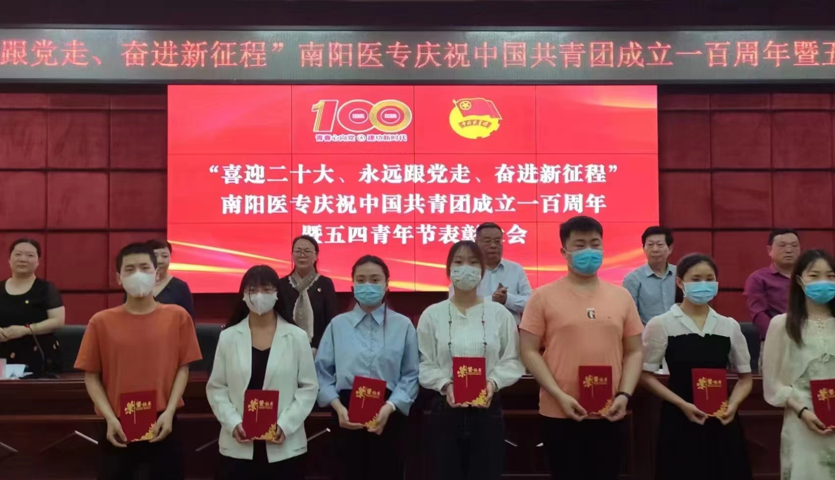 首先,大家共同观看了《正青春 共前行》南阳医专共青团工作宣传片。随后,表彰大会在庄严的国歌声中拉开帷幕。校团委书记徐晓杰宣读《关于公布2022年度“活力杯”南阳医专共青团基层基础工作大赛获奖名单的通知》《关于公布“喜迎二十大、永远跟党走、奋进新征程”主题宣传教育实践活动获奖名单的通知》和《关于表彰2021年度“五四红旗团总支”“团员先锋岗”“先进团支部”“模范团干部”“优秀共青团员”和“优秀学生会干部”的决定》。与会领导为获奖代表颁奖。获奖集体代表临床医学系团总支书记王川和获奖个人代表护理系周思雨上台做了热情洋溢的发言。