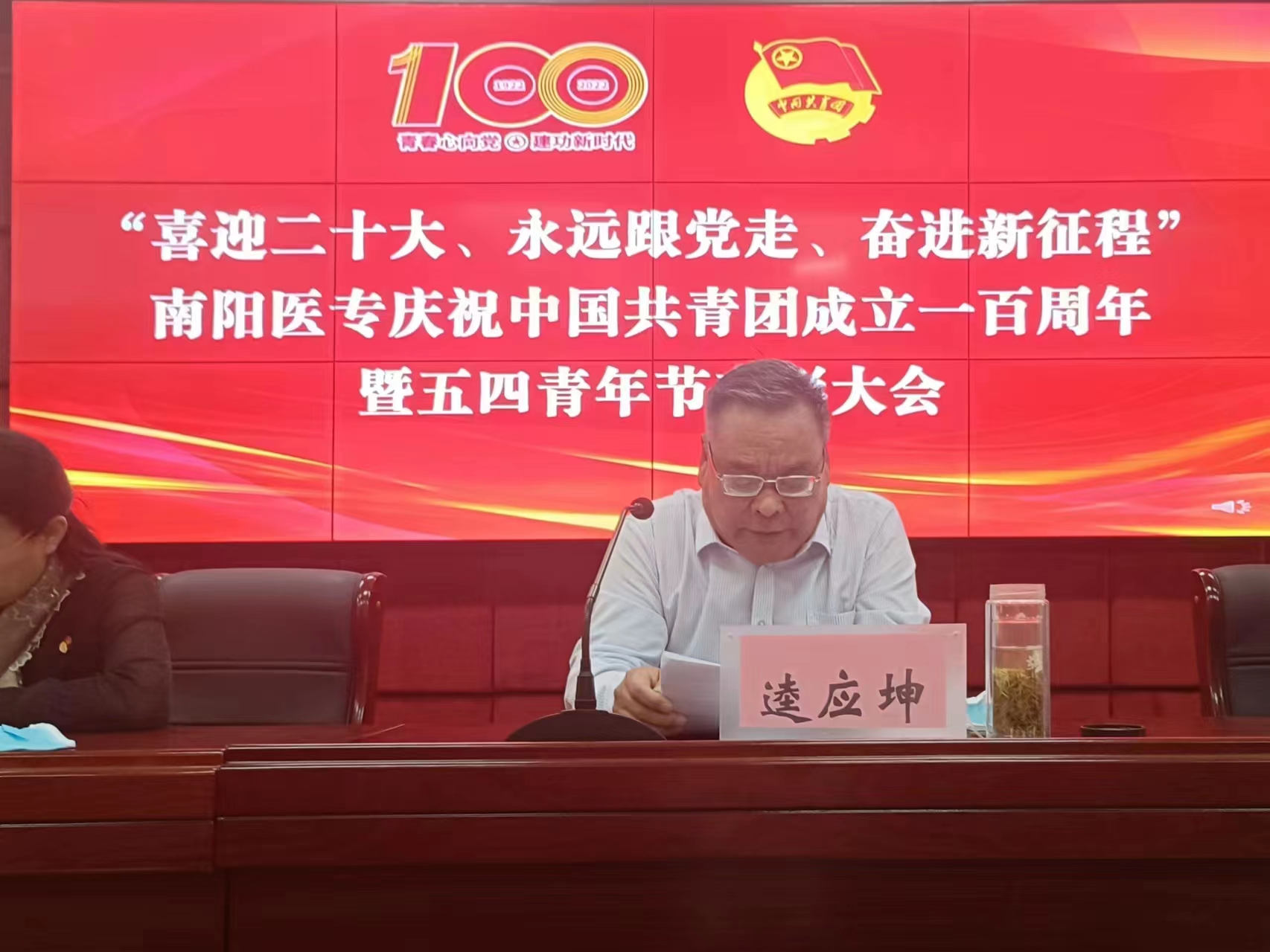 本网讯(文/校团委 庞博)2022年5月4日下午,校团委在图书馆五楼学术报告厅成功举办“喜迎二十大、永远跟党走、奋进新征程”南阳医专庆祝中国共青团成立一百周年暨五四青年节表彰大会。校党委副书记逵应坤,校党政办主任江学法,党委组织部部长杜晓平,党委宣传部部长李红普,党委学工部部长、校学生处处长梁顺平,校团委书记徐晓杰,以及各个系(部、院)团总支书记和全校团员代表参议会议。会议由校团委副书记古婵婵主持。