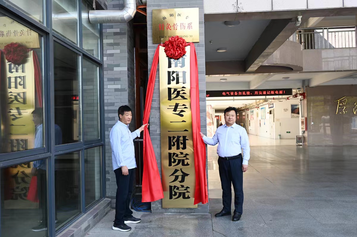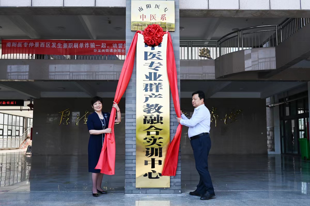 本网讯(文/中医系 张晓丽)5月5日上午,南阳医专二附院分院暨中医专业群产教融合实训中心揭牌仪式在仲景东区教学楼前广场举行。副校长郭万周、范真,二附院院长乔泽强,学校相关部门负责人及教职工代表和学生代表参加。揭牌仪式由中医系主任王春成主持。
