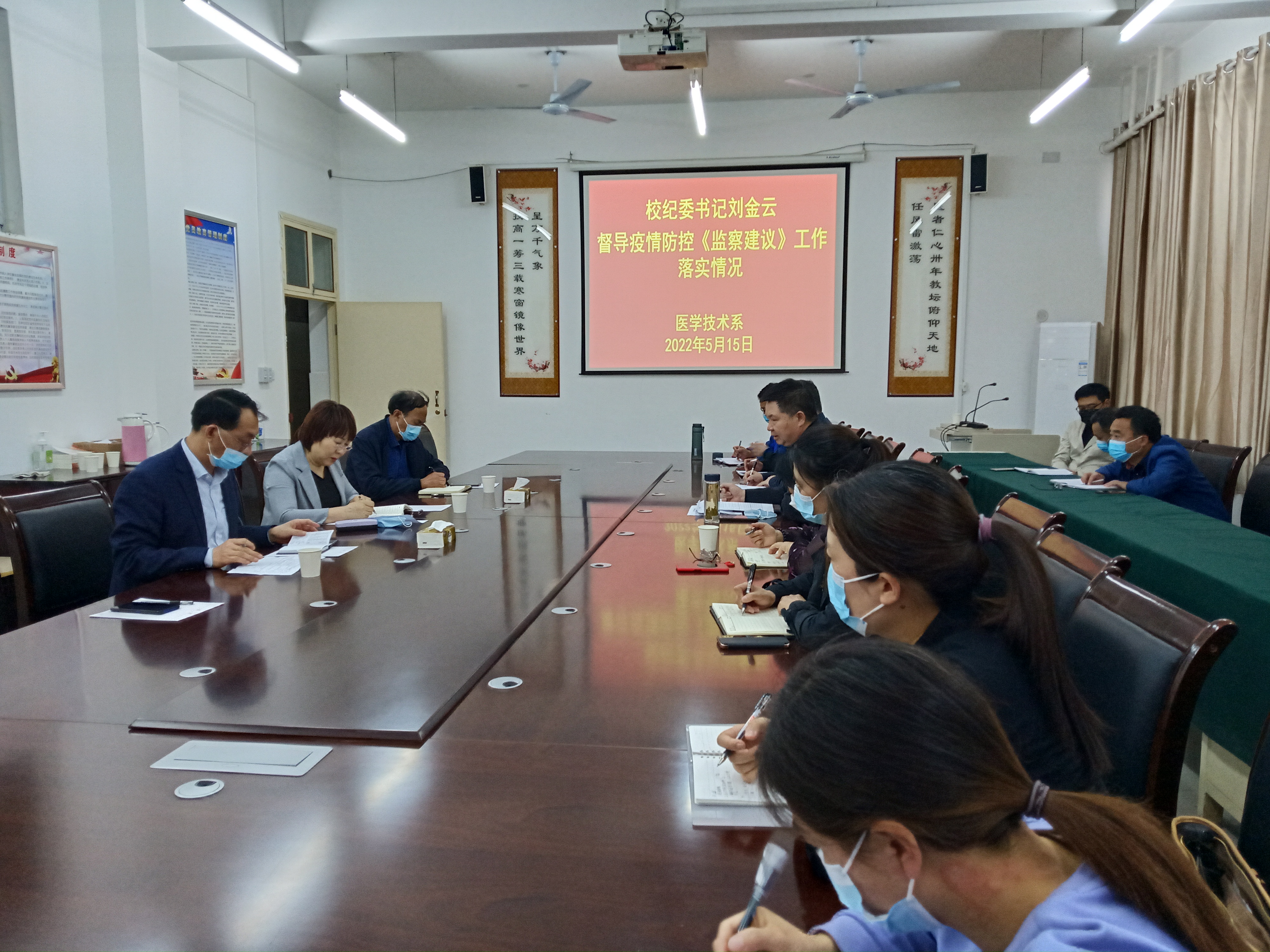 医技系党总支书记孙振国汇报了《监察建议》各项工作的整改落实情况,从贯彻疫情防控“十严查”、师生疫情信息登记、教职工“两点一线”每日2次打卡、在校生和专升本学生教育管理与心理疏导、系领导和辅导员24小时带班值班等方面做了详细汇报。