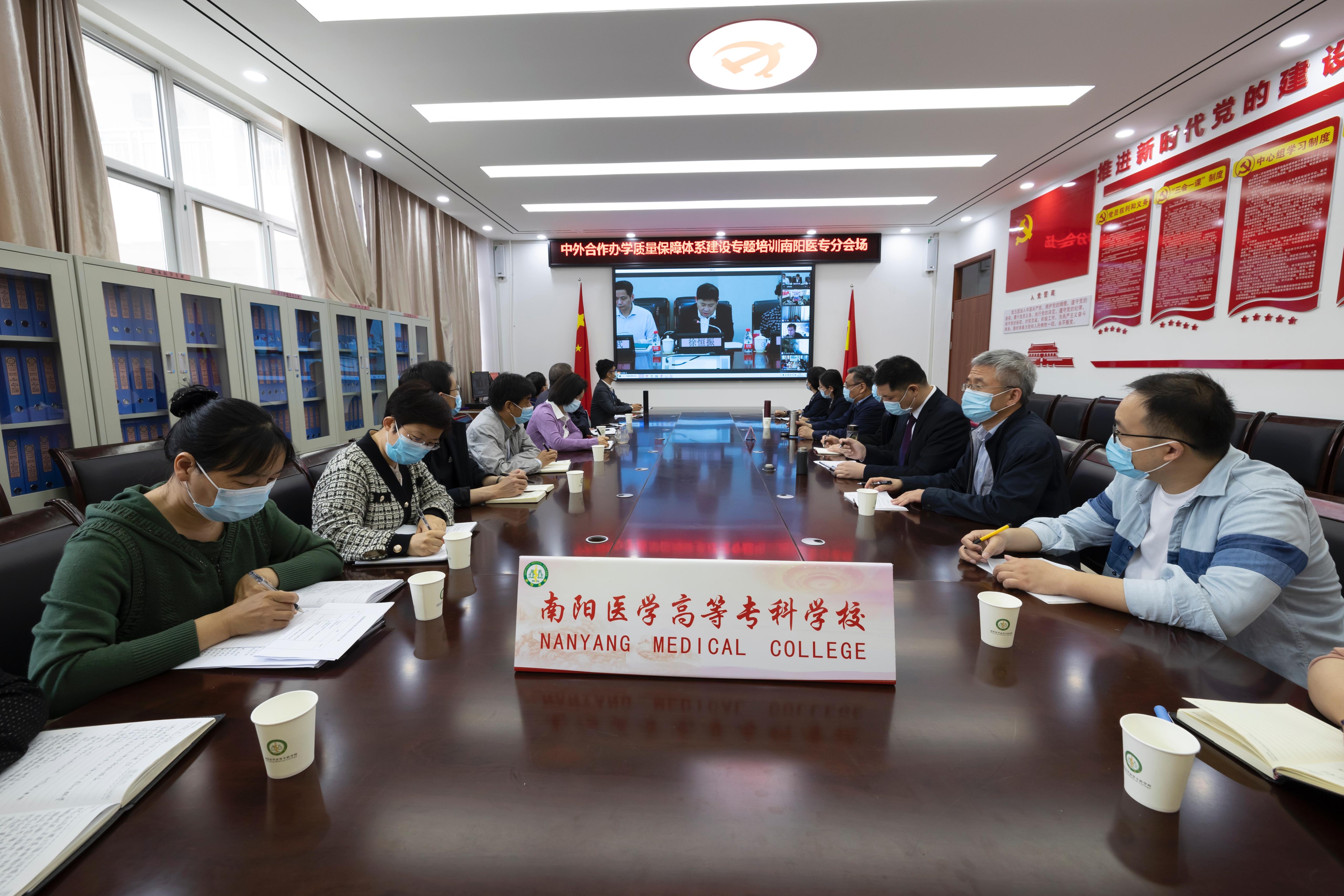 本网讯(文/外事处 周国军)5月19日,河南省中外合作办学质量保障体系建设专题培训通过视频方式召开,会议由省教育厅对外合作与交流处处长、省教育国际交流协会秘书长王华星主持,省教育厅二级巡视员、省教育国际交流协会协会会长徐恒振做开班致辞。我校分会场设在仲景西区3号教学楼423会议室,党委副书记逵应坤出席会议,教务处、计财处、质量管理办公室、外事处、临床医学系、药学系、护理系、医学技术系、口腔医学系、康复医学系、国际教育学院等部门负责人参加培训。