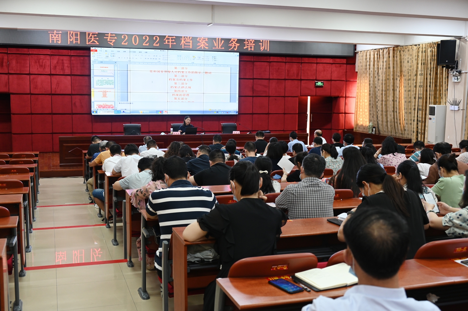 本网讯(文/档案中心 王萍)为了加强我校档案管理工作,提升各部门(单位)的归档意识和业务水平,2022年6月10日,我校在图书馆五楼报告厅举行2022年档案业务培训会,特别邀请了南阳市档案馆四级调研员、副研究馆员陈明英作专题辅导。学校各部门(单位)分管档案工作的领导和兼职档案员参加了培训。党委委员、副校长张胜海主持会议。