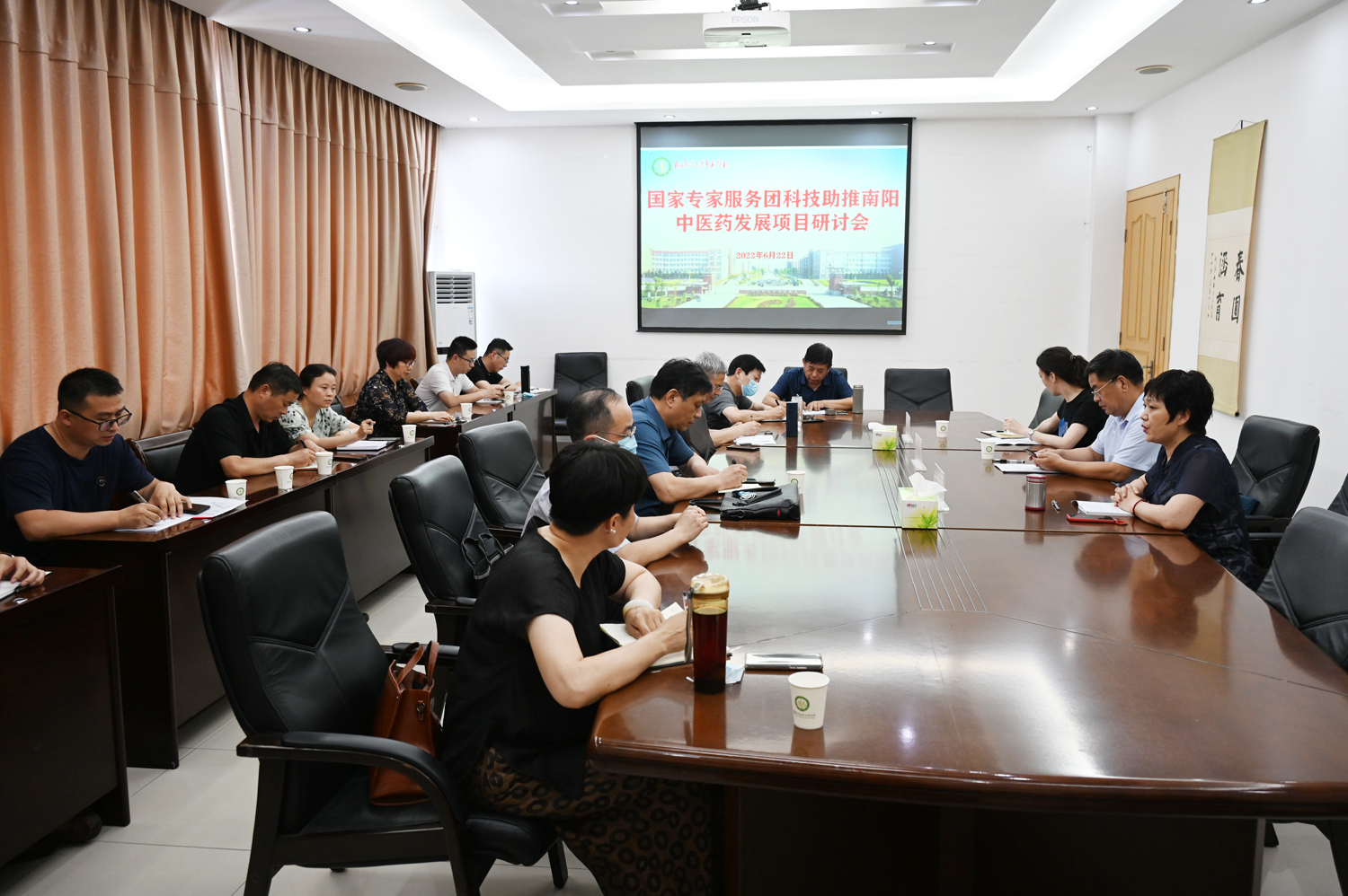 本网讯(文/发展规划办公室 马凤巧)6月22日下午,国家专家服务团科技助推南阳中医药发展提升项目和仲景灸法技能培训方案研讨会在我校召开。校党委委员、副校长范真,南阳市中医药发展局副局长张长河、中医药发展服务中心科长任冲科、中医药专家服务团成员、以及中医系、药学系、针灸骨伤系、二附院、党政办、教务处、科研处、继续教育学院、发展规划办等部门负责人参加了会议。会议由范真主持。