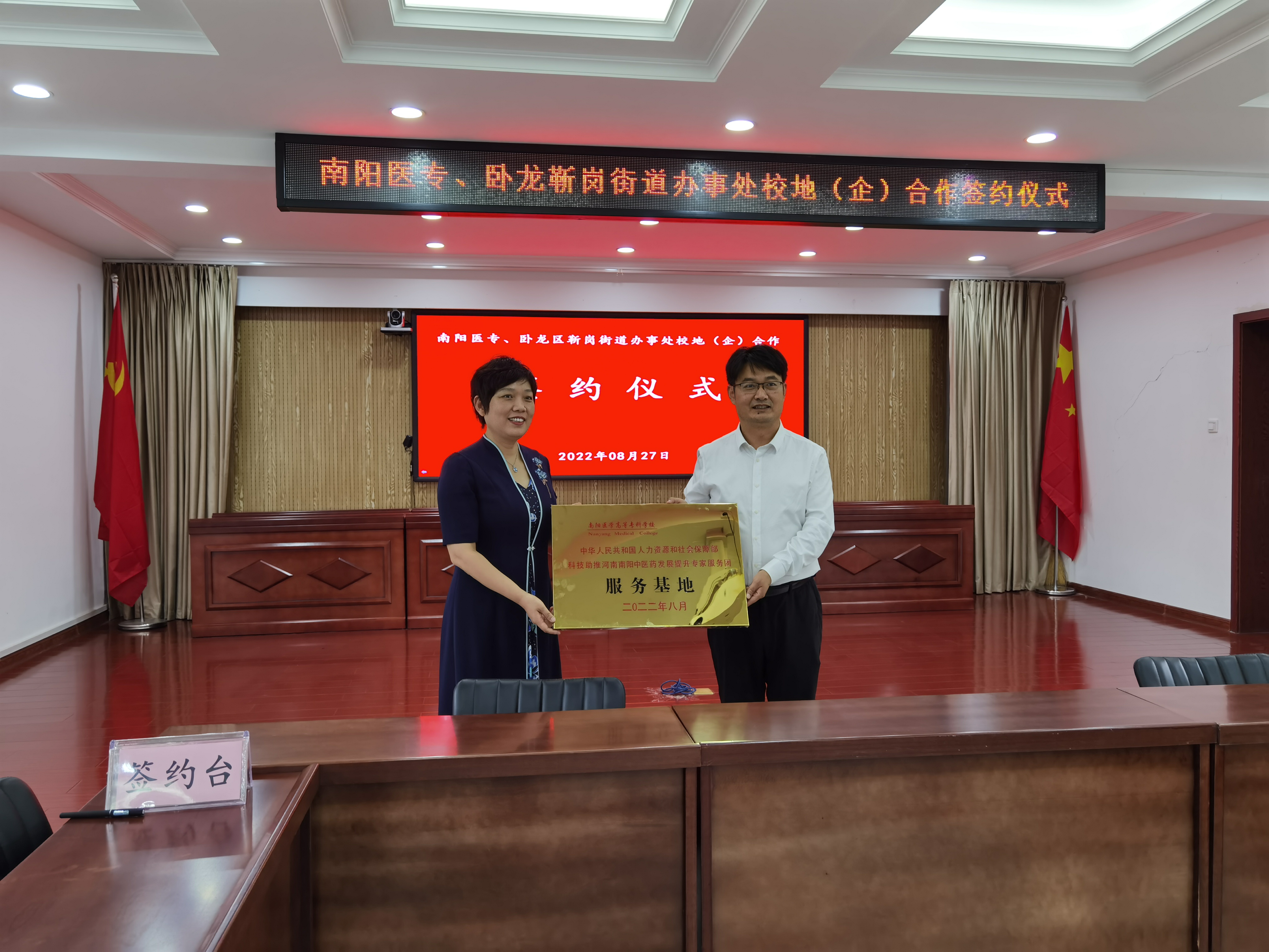 签约仪式上,范真副校长为靳岗街道办事处授牌“人社部科技助推河南南阳中医药发展提升专家服务团服务基地”。靳岗街道办事处主任王可、我校专家服务团代表、药学系主任袁国卿教授代表校地双方签署了合作协议。教务处处长刘荣志及各服务分团团长参加了签约仪式。