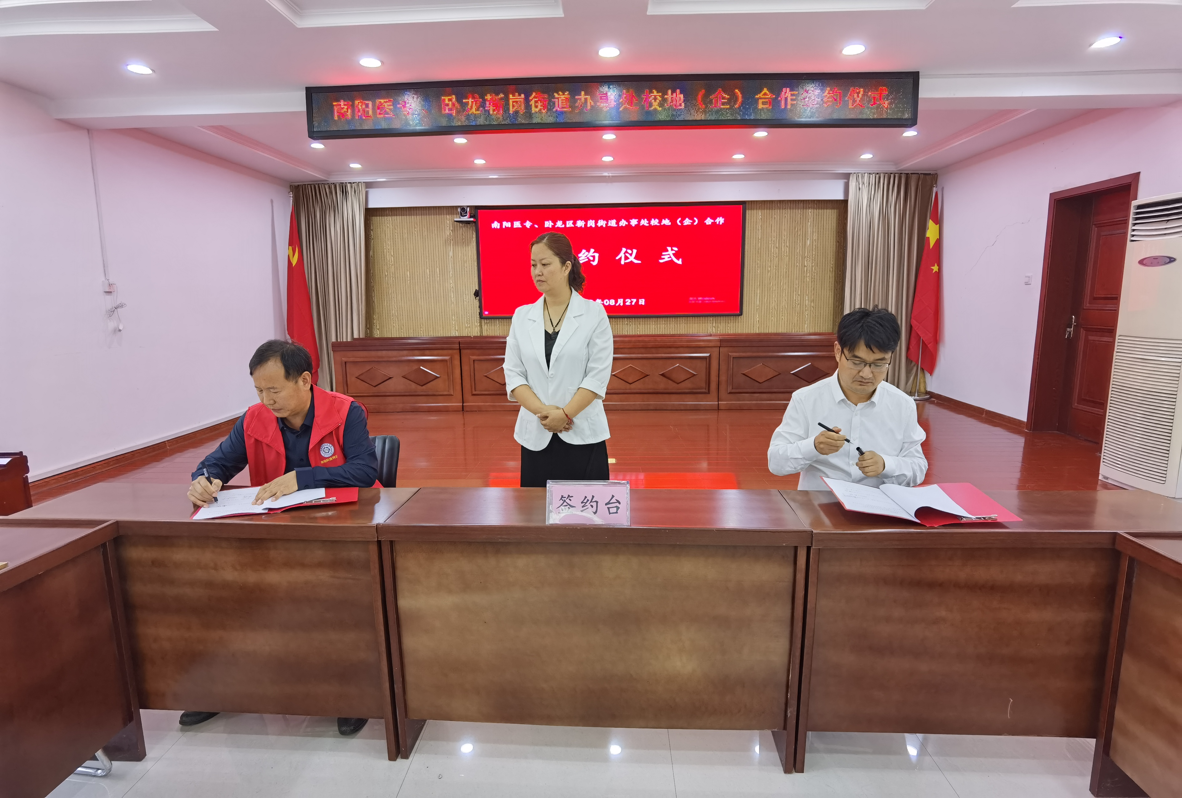 本网讯(文/科研处 王卫娜)8月27日上午,我校与南阳市卧龙区靳岗街道办事处校地(企)合作签约仪式在卧龙区靳岗街道办事处举行。卧龙区政府副区长冯自敬,我校副校长范真出席相关活动,仪式由靳岗街道党工委书记安建海主持。
