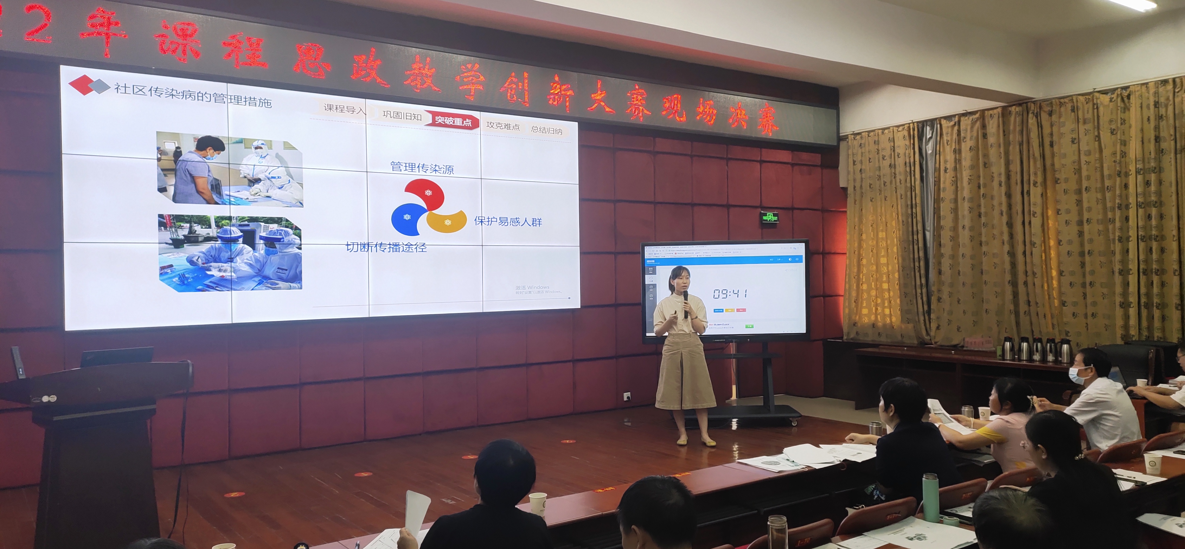 现场决赛于8月26日,在仲景西区图书馆5楼报告厅举行,采用了主会场+线上分会场的方式。学校各系(部、院)教师代表参加了活动,其他教师通过线上收看决赛直播。校党委委员、副校长范真出席活动并发表讲话,教务处处长刘荣志,各系(部、院)主任参与了本次大赛。范真在讲话中强调了课程思政的重要意义,介绍了近年来我校参加教学技能比赛相关活动的基本情况及取得的显著成绩,并对全体教师的今后发展提出了殷切希望。希望教师们以比赛平台为契机,及时总结、研讨,分享成果,共同提高。
