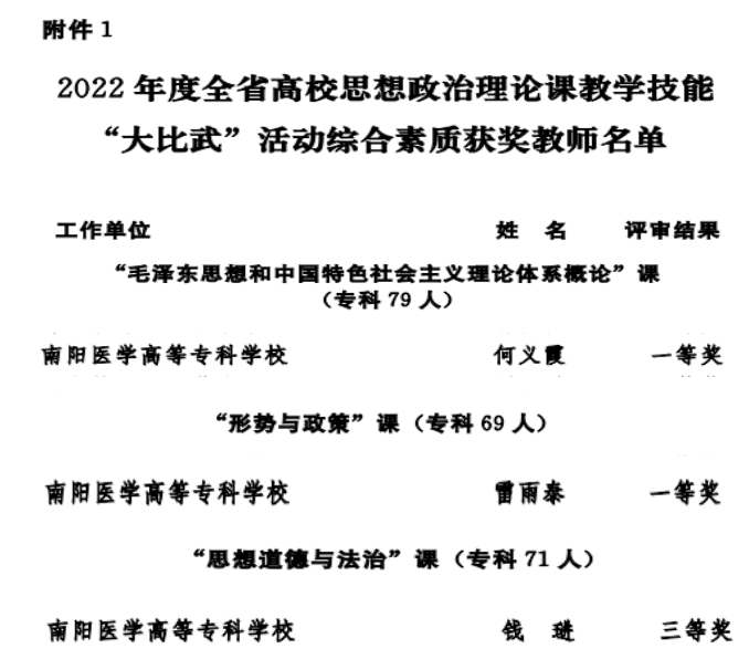 本网讯(文/马克思主义学院 冯晓青)近日,省委宣传部、省委教育工委、省教育厅公布了2022年度全省高校思政课教学技能“大比武”活动的评选结果(豫教工委[2022]84号文件),我校马克思主义学院何义霞、雷雨泰两位教师每人荣获“大比武”活动“综合素质”和“教学展示”两项一等奖,钱琎老师获得“综合素质”三等奖、“教学展示”二等奖。