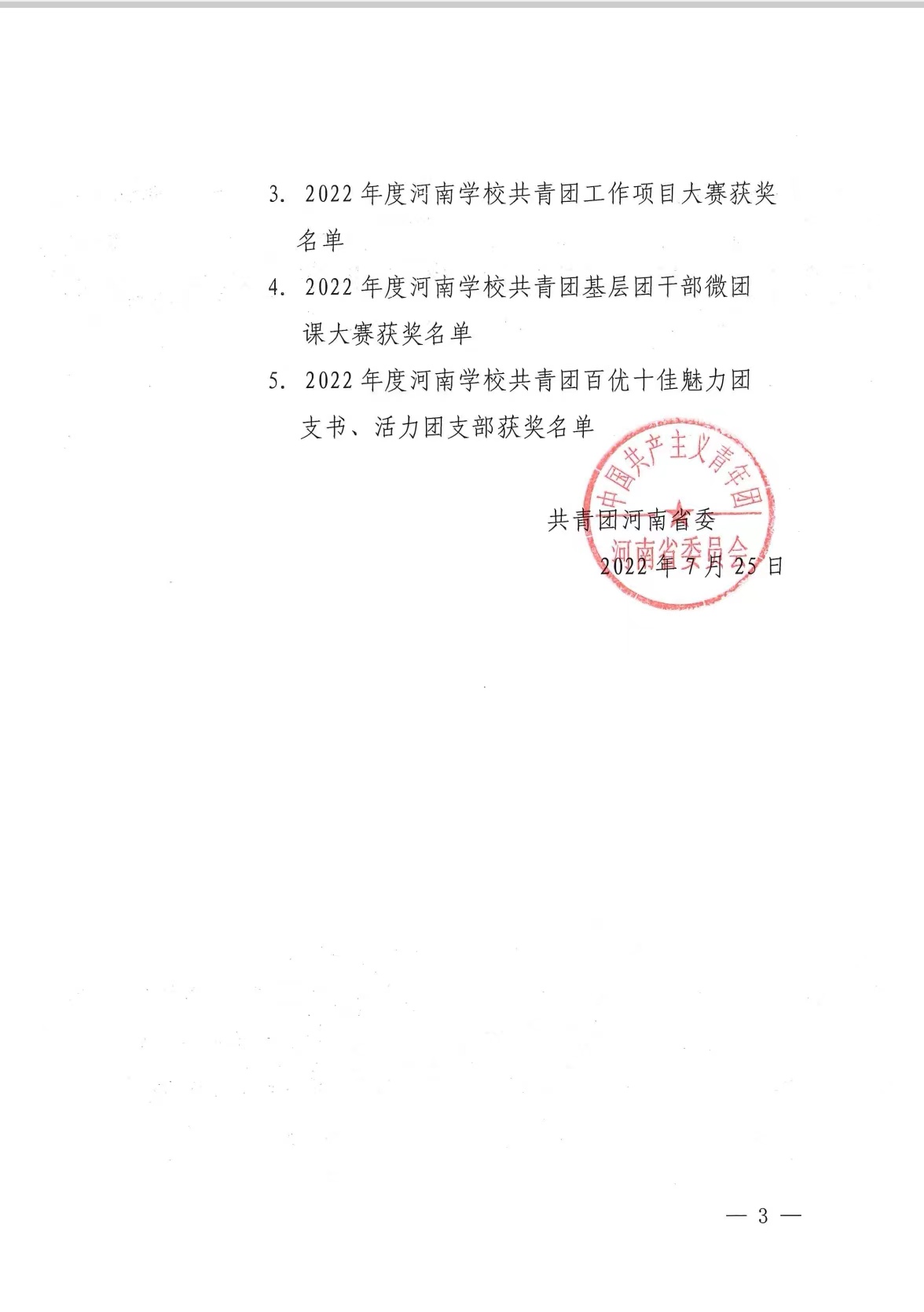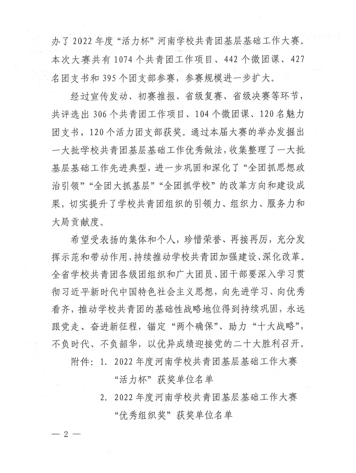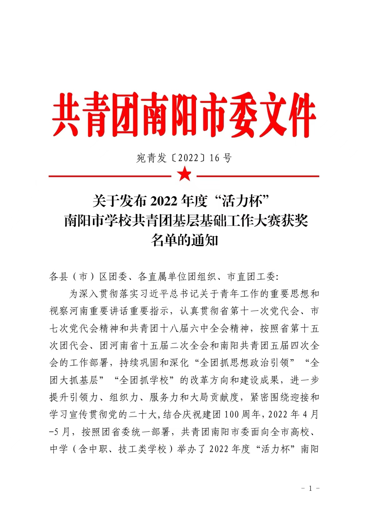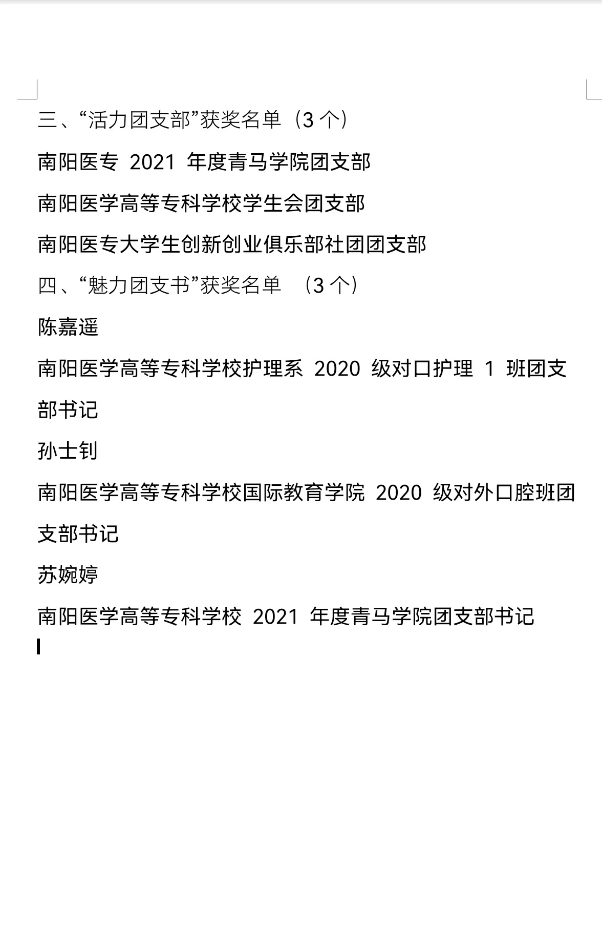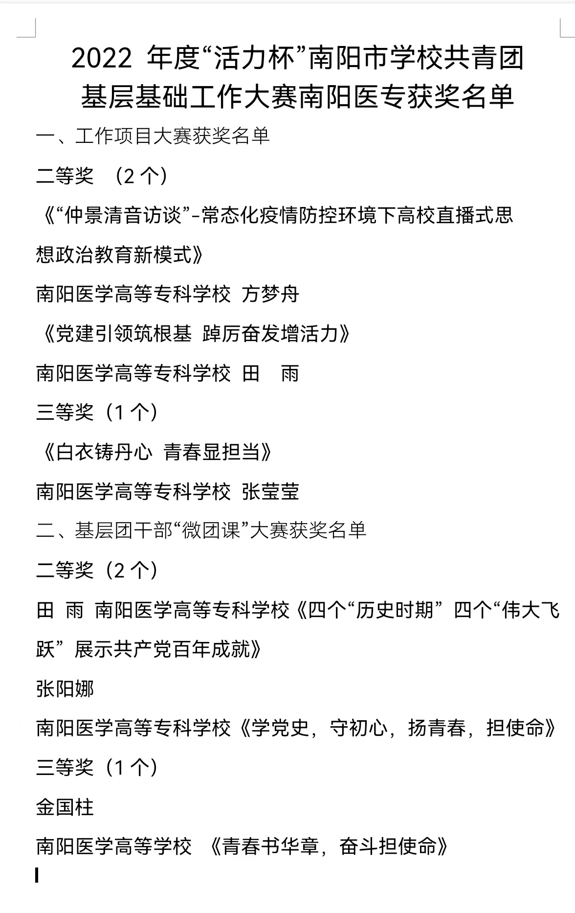 本网讯(文/校团委 马黎莉)近日,共青团河南省委下发了《关于发布2022年度“活力杯”河南省学校共青团基层基础工作大赛获奖名单的通知》(豫青字[2022]26号),共青团南阳市委下发了《关于发布2022年度“活力杯”南阳市学校共青团基层基础工作大赛获奖名单的通知》(宛青发[2022]16号)。我校在省、市两级大赛中喜获佳绩:南阳医专2021年度青年马克思主义者培养学院直属团支部、南阳医专大学生创新创业俱乐部社团直属团支部分别荣获河南省百优“活力团支部”。在市级比赛中,我校荣获共青团工作项目二等奖等12个奖项。