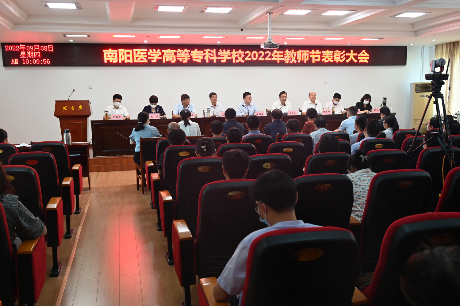 本网讯(文/党政办 毕大鹏)为庆祝第38个教师节,9月8日上午,学校采取线上主会场和线下分会场相结合的形式,举行了2022年教师节表彰大会。大会主会场设在1号办公楼5楼会议室,校领导班子成员,优秀教师、优秀教育工作者代表,以及各处(室)负责同志,各系(部、院)主任参加了会议。分会场设在各系(部、院),参会人员为各系(部、院)书记、全体专兼职教师、全体辅导员。其他党政和后勤教辅部门人员在各自办公室通过手机钉钉群直播自行进行了观看。会议由校长王立义主持。
