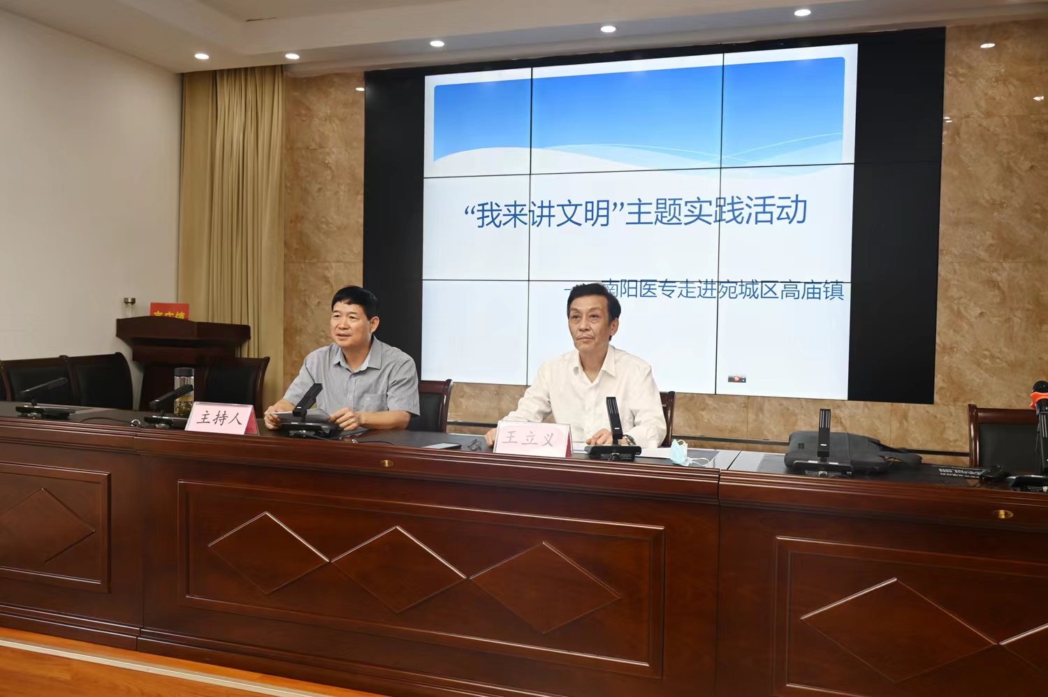 本网讯(文/宣传部 张旭斌)9月14日上午,校长王立义赴宛城区高庙镇开展“我来讲文明”主题实践活动。高庙镇党政班子成员、相关部门人员与部分村委成员、文明商户代表50多人参加主题讲座。讲座由宛城区政府党组成员姚河予主持。