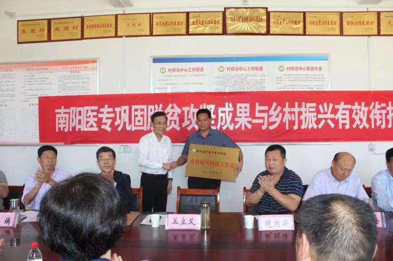 王立义校长为方城县广阳镇官坡岭村“乡村振兴工作站”授牌;党委组织部长杜晓平宣读新老帮扶队员交接名单;副校长张国良总结了我校定点帮扶官坡岭村工作情况。