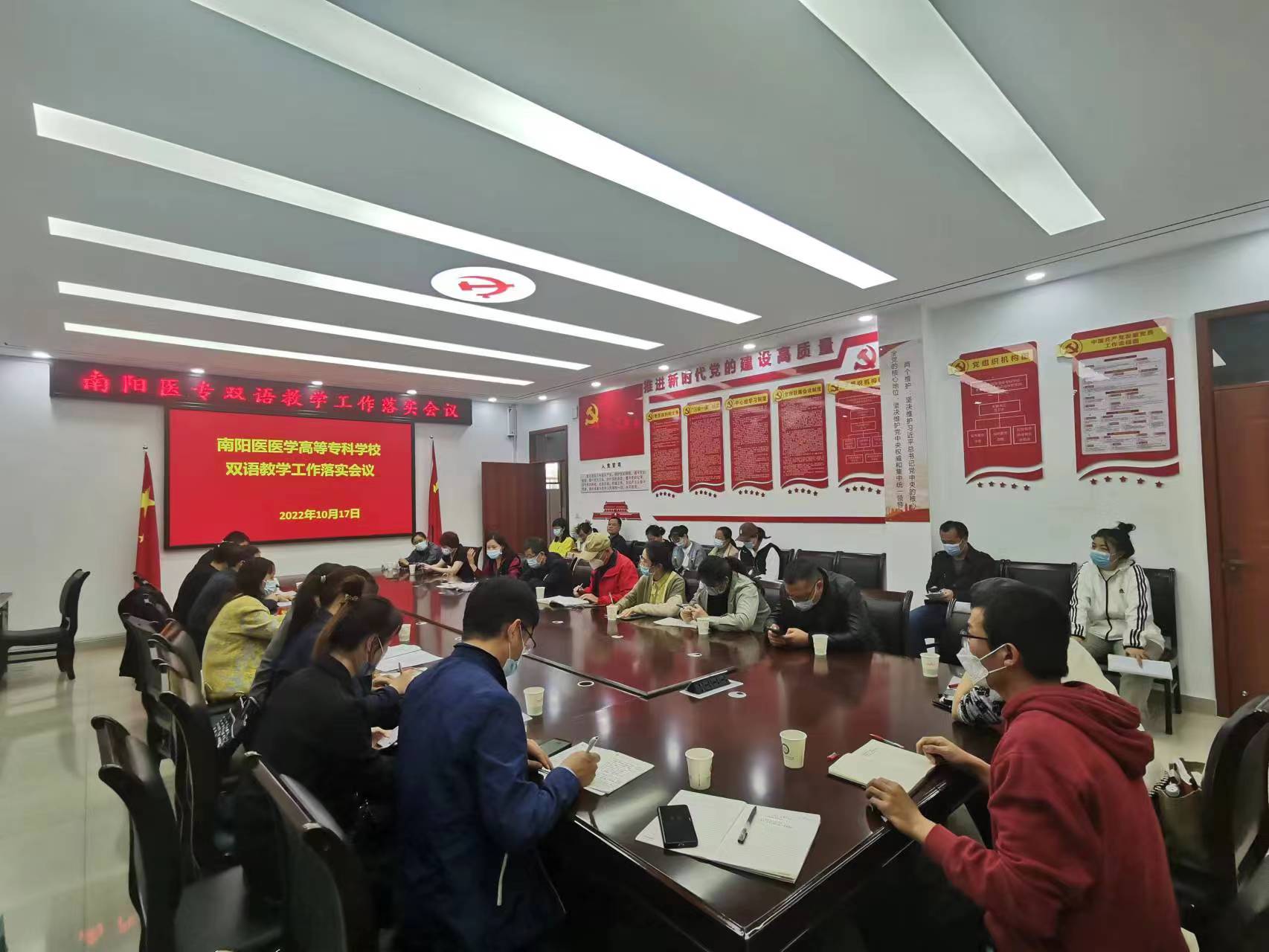 听课结束后,张国良副校长参加了在仲景西区三号教学楼423会议室召开的“双语教学工作落实会议”,临床系、护理系、医技系、口腔医学系、康复医学系、基础医学部主抓教学副主任和相关任课教师参加。李弋院长介绍了开展双语工作的目的、意义、要求,要求老师们积极参与中外合作办学双语教学工作;李连焕副院长就双语教学工作的落实细节进行了详细解读,针对《关于开展双语教学课程认定的办法》《关于成立双语教学工作领导小组的通知》及《国际教育学院课程考核管理办法》中大家提出的问题进行了一一解答,并提出要与外方教师深入进行教学研究,积极开展线上联合备课和联合科研工作。