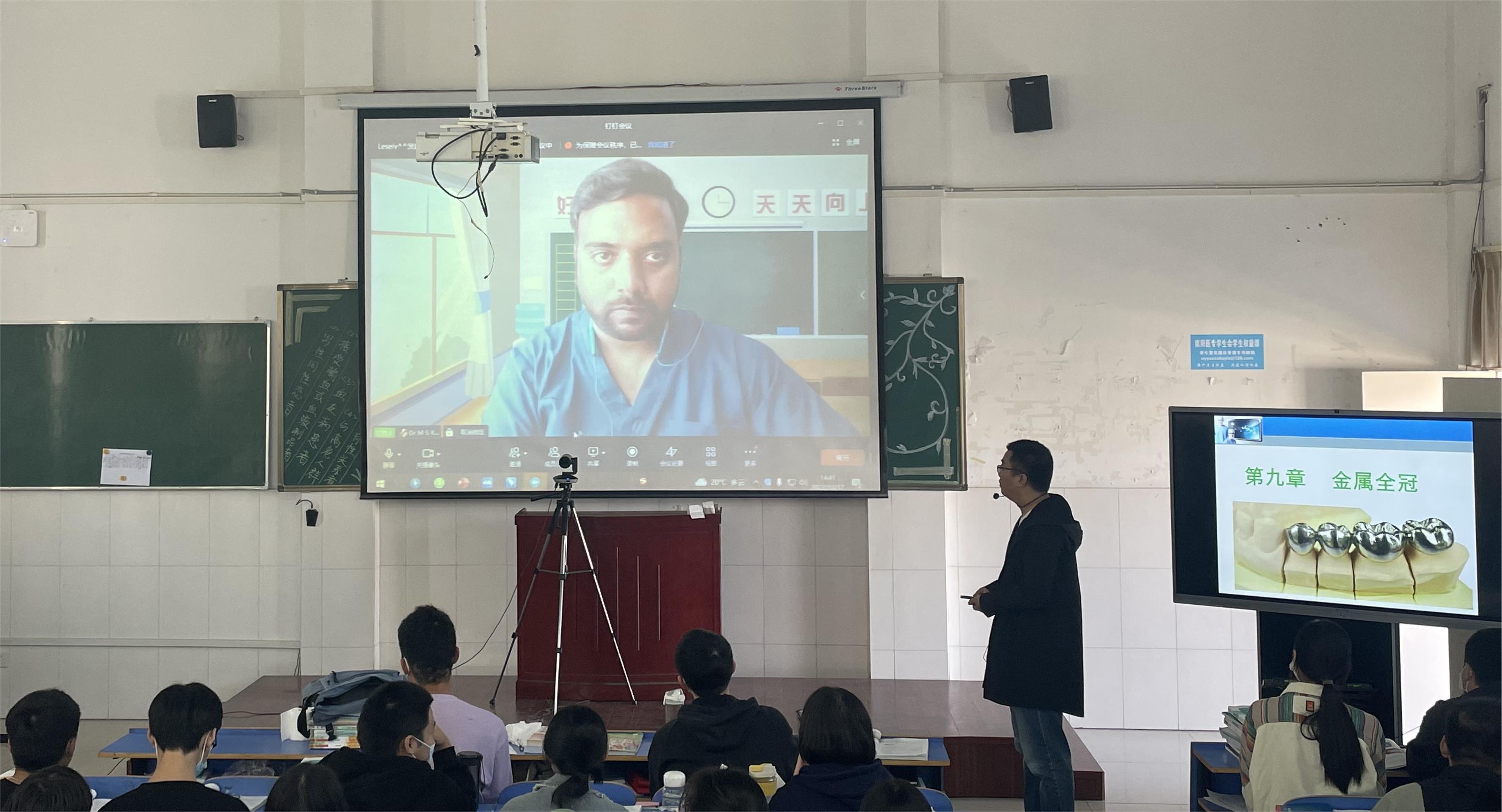 10月17号下午,副校长张国良深入国际教育学院听取外教Karthink教授《口腔修复学》直播课程。口腔专业教师助教老师孟中伟英语口语流畅,《铸造金属全冠》教学内容与外教互动效果良好,受到听课学生和领导一致好评。