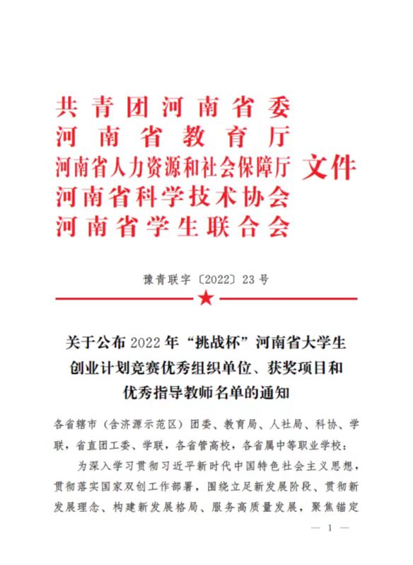自2022年5月河南省“挑战杯”大学生创业计划竞赛启动以来,校团委高度重视、充分动员、积极组织,面向全校征集作品,在校赛阶段收到参赛项目38件。按照大赛的要求,通过校赛选拔产生出的21件参赛项目报送参加省赛。后经省级复赛、省级终审决赛两个阶段的评审,最终取得了优异成绩。