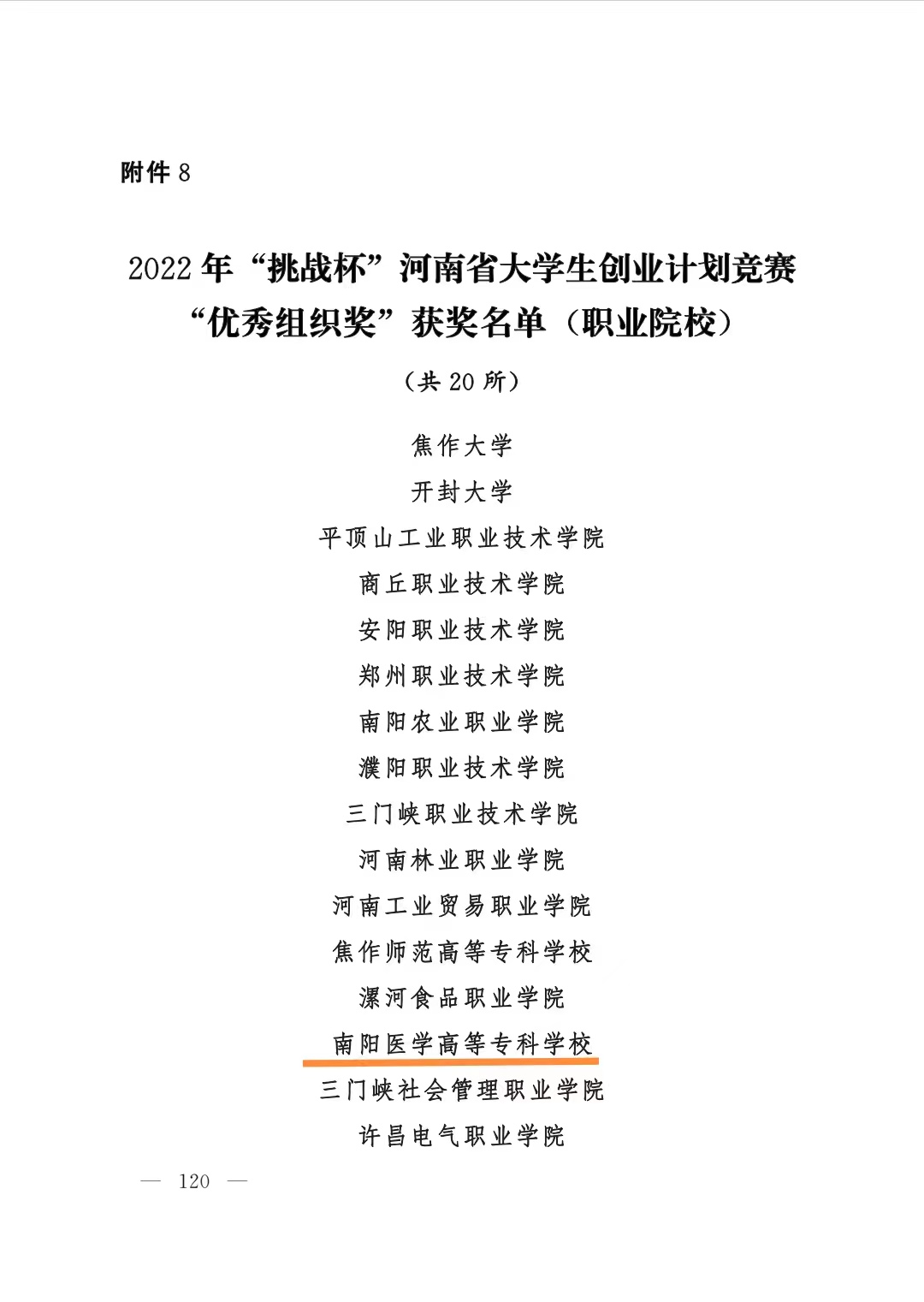 本网讯(文/校团委 庞博)近日,共青团河南省委、河南省教育厅、河南省人力资源和社会保障厅、河南省科学技术协会、河南省学生联合会联合下发了《关于公布2022年“挑战杯”河南省大学生创业计划竞赛优秀组织单位、获奖项目和优秀指导教师名单的通知》(豫青联字[2022]23号),我校荣获职业院校类别优秀组织奖,参赛项目《 “艾草之乡”一站式服务平台》荣获职业院校类别银奖,《“启明星”儿童健康培训中心》等12件参赛项目荣获职业院校类别铜奖。