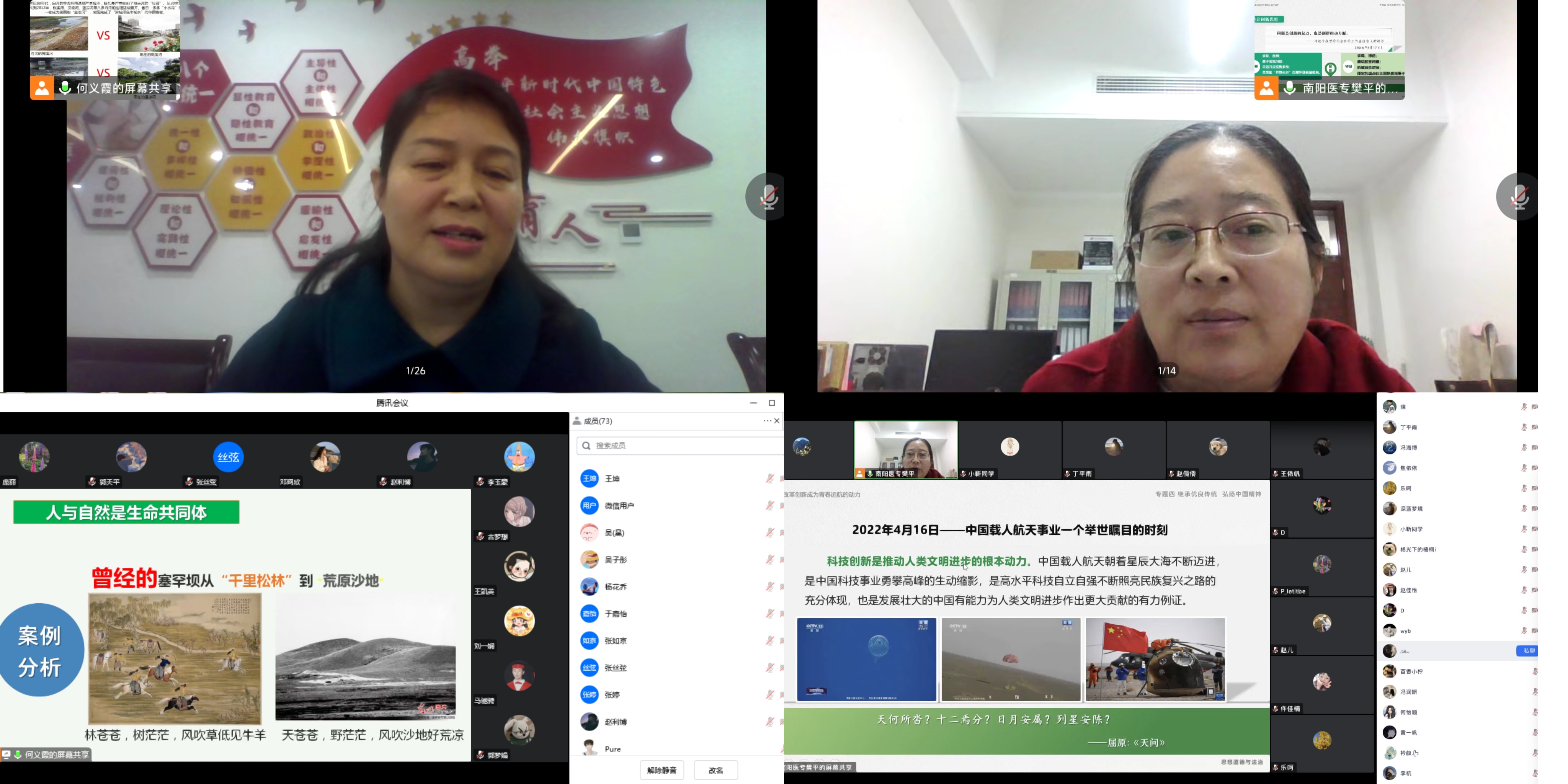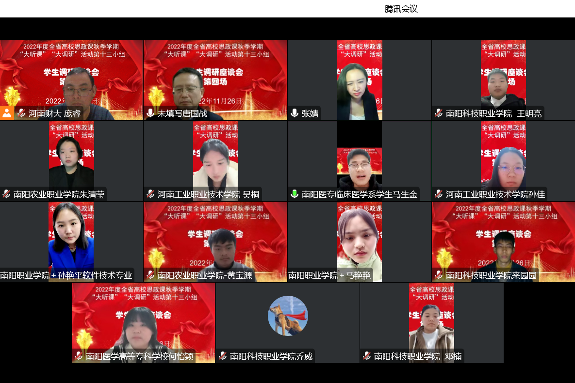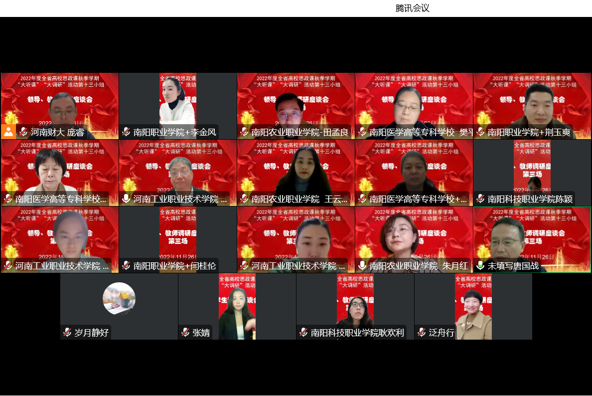 本网讯(文/马克思主义学院 庞丽)为深入贯彻习近平总书记在中国人民大学考察时的重要讲话精神,认真落实《中共河南省委教育工委办公室 河南省教育厅办公室关于开展2022年度全省高校思政课秋季学期“大听课”“大调研”活动的通知》,不断提升我校思政课教师教学能力,11月23日和11月26日,以信阳师范学院马克思主义学院院长唐国战为组长的调研组对我校进行云端听课和调研座谈。