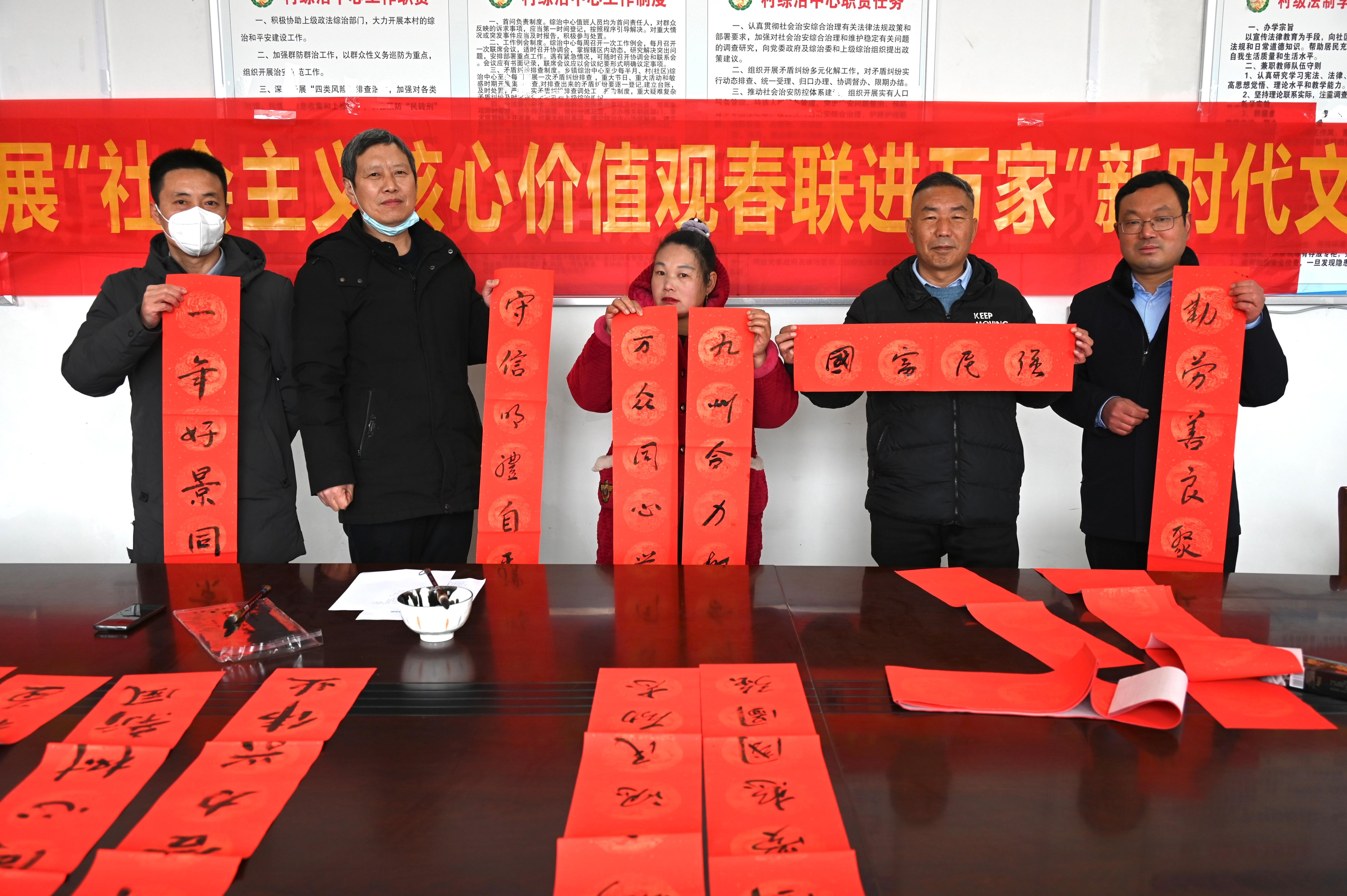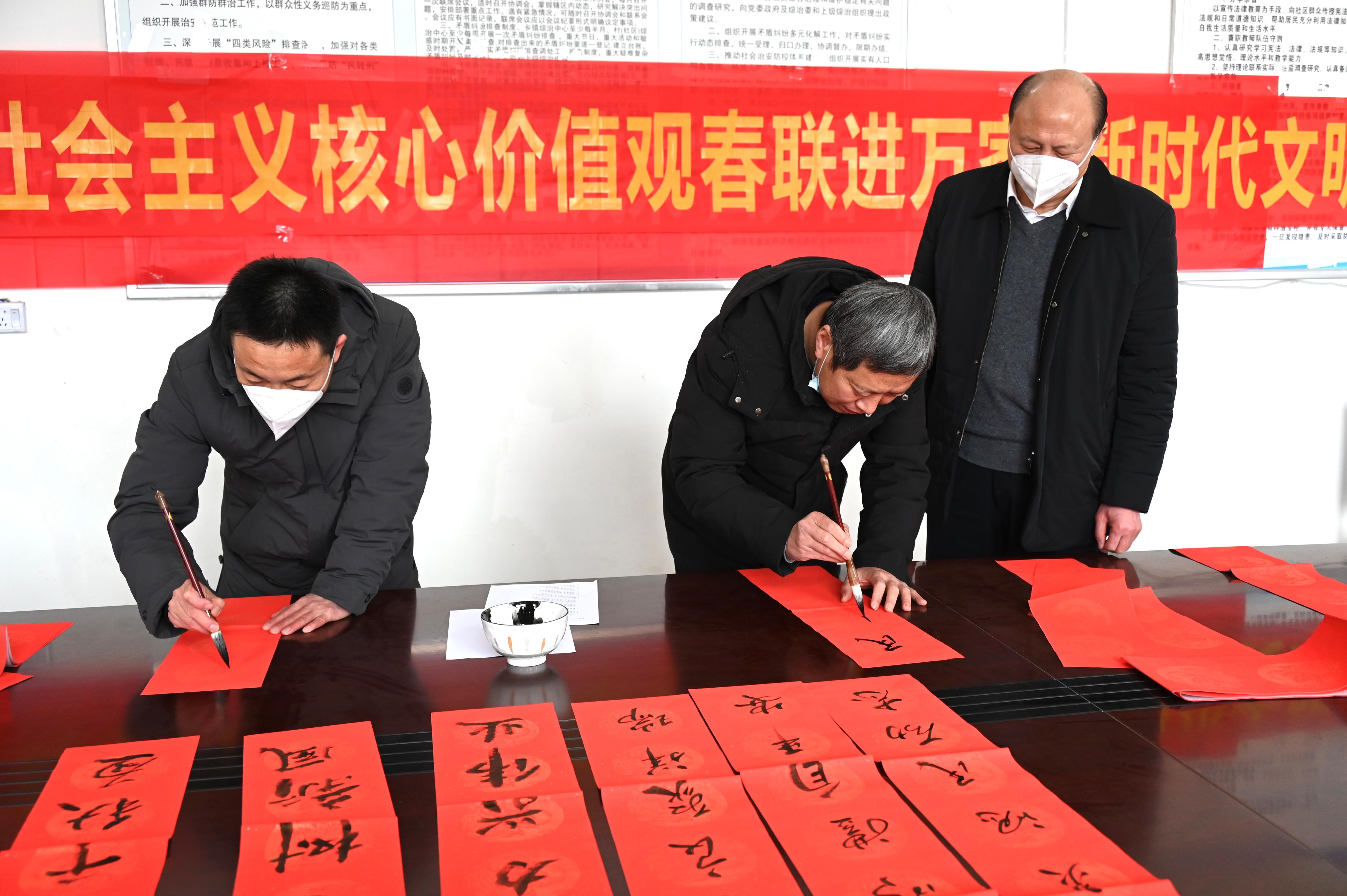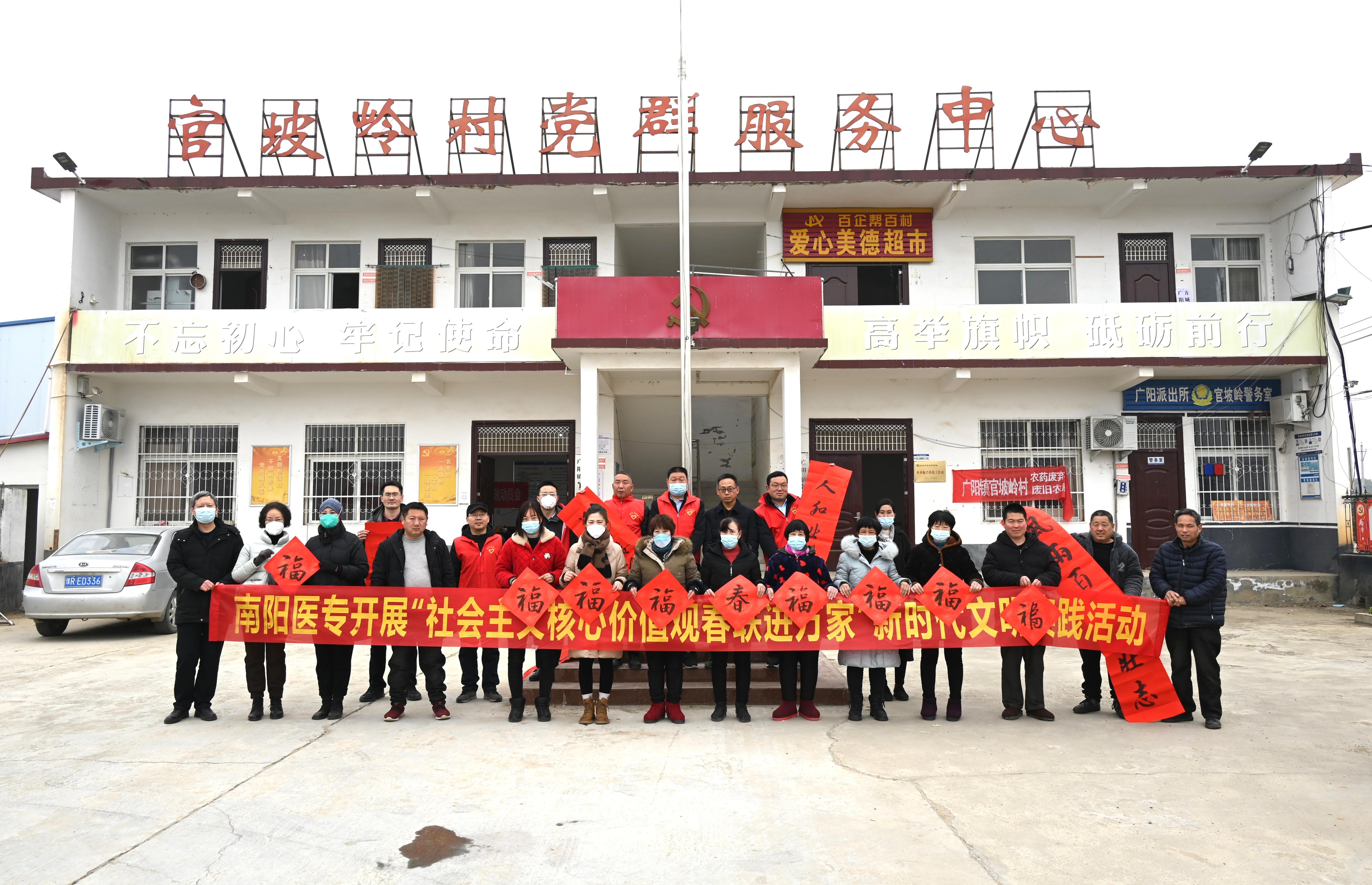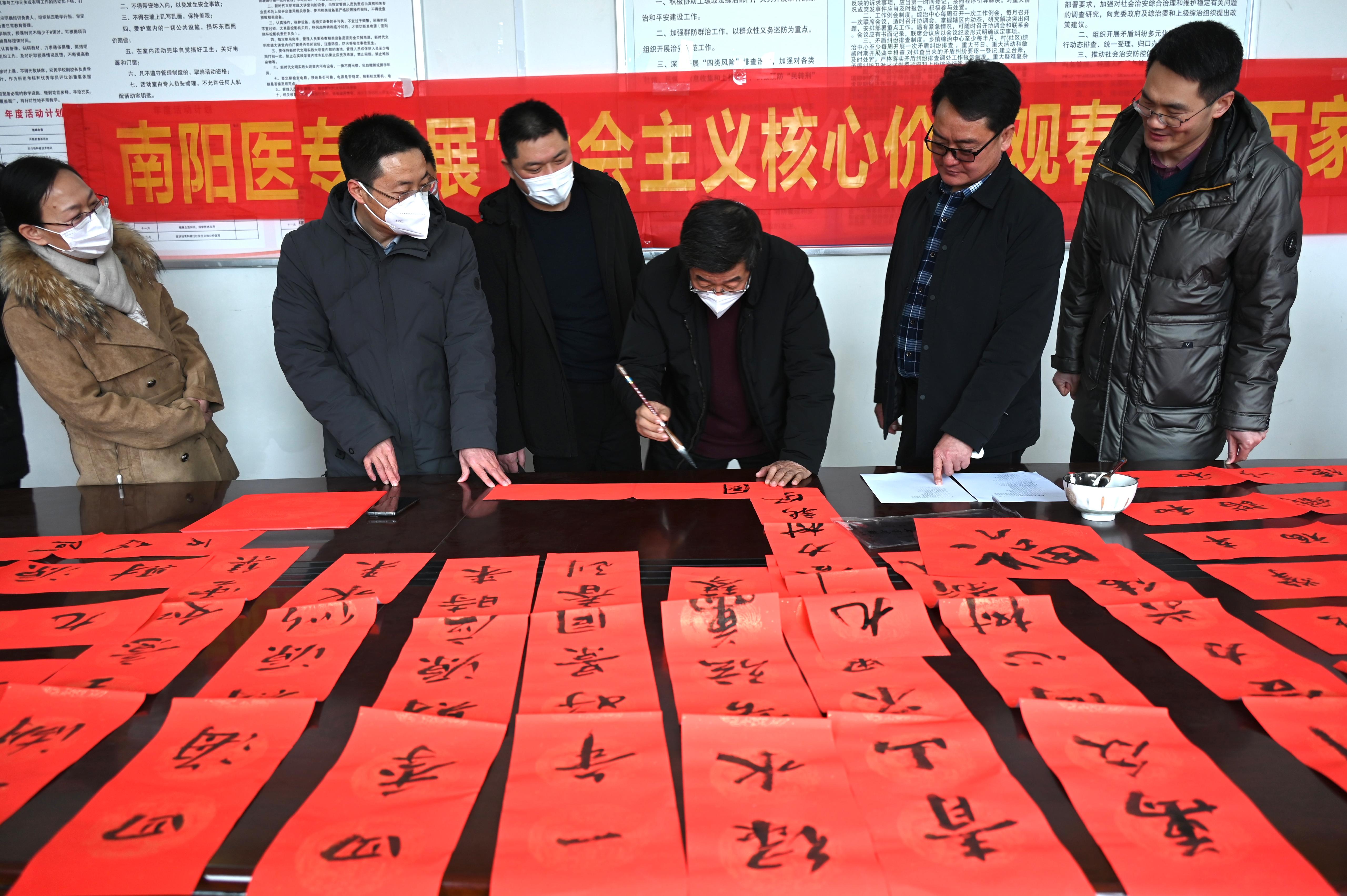 本网讯(文/宣传部 张旭斌)为深入学习宣传贯彻党的二十大精神,不断满足人民群众对文化生活的新需求、新期待,传承中华优秀传统文化,营造喜庆祥和的迎新春节日氛围,1月11日上午,南阳医专副校长张国良、张胜海、郭万周带领学校相关部门负责人和党员志愿者来到方城县广阳镇官坡岭村开展“我们的节日·春节——春联进万家”文明实践志愿服务活动,为广大群众送上新春的问候与祝福。