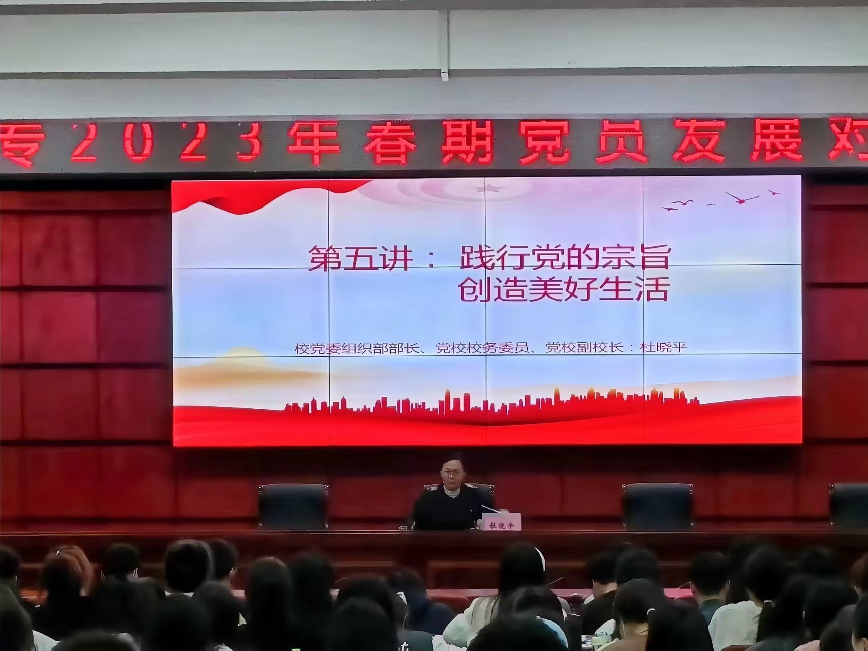校党委委员、纪委书记刘金云以《青年学生该如何适应短视频时代》开篇,用大量鲜活图片及生活事例,从而调动了学员课堂积极性,引发学员思考,奠定基调,思想性与实践性兼备。校党委委员、副校长范真从中国共产党革命时期、建设时期、发展时期三个时期以及当代奋斗者的故事并结合自身,为学员讲述了新时代青年如何走向幸福。党委组织部部长杜晓平引经据典,将党的宗旨和美好生活紧密联系,使学员们对牢树党的宗旨意识有了更深刻的理解与认识。党委统战部部长王岩在《铸牢中华民族共同体意识》中详细阐述了铸牢中华民族共同体意识的精神内核以及意义所在。党委宣传部部长李红普深刻阐述了在新时代背景下,如何争做优秀共产党员,为党课画上了圆满句号。