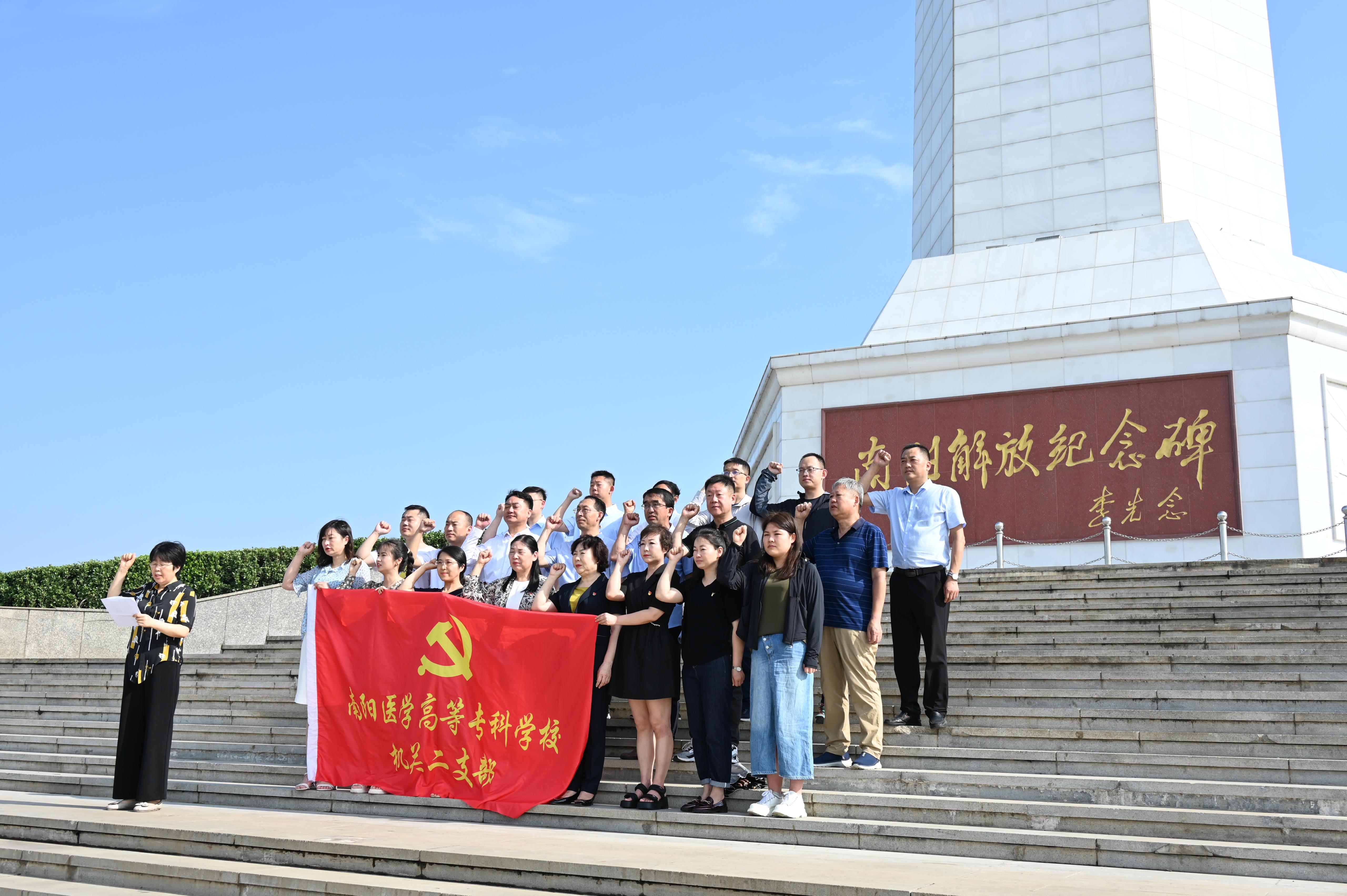 本网讯(文/人事处 李建效)6月30日上午,机关二支部全体党员怀着无比崇敬的心情来到南阳解放广场,开展重温入党誓词、瞻仰解放纪念碑主题党日活动,校党委委员、纪委书记刘金云参加活动。活动由支部书记孟晓红主持。