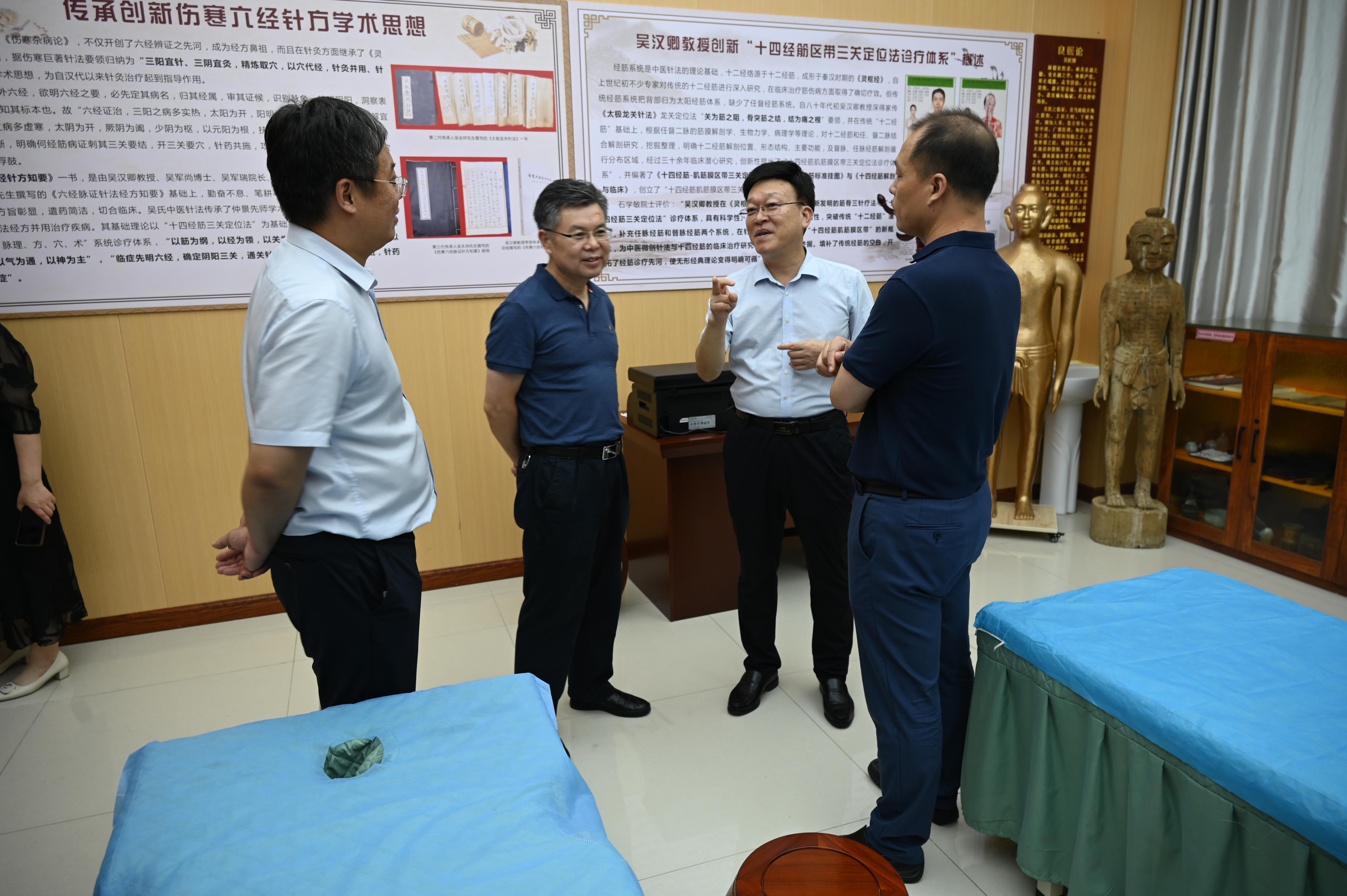高拓一行在南阳市参加省科技厅科技服务综合体试点工作推进会期间来到我校仲景东区,先后走进科研实验中心、传统医药非物质文化遗产中心参观考察。科研处处长王宇卿博士详细汇报了我校在科研平台建设及科技创新方面取得的进展,特别是开展中医药和艾草研究服务地方经济发展取得的成效。在传统医药非物质文化遗产中心,高拓等人查看了李氏针灸、胡氏捻筋、吴氏中医针法、大刘骨科、申氏艾灸、王氏疤痕灸、骞氏经筋膏等传承人工作室,详细了解我校传统医药非物质文化遗产中心的鲜明特色和下一步的建设规划。