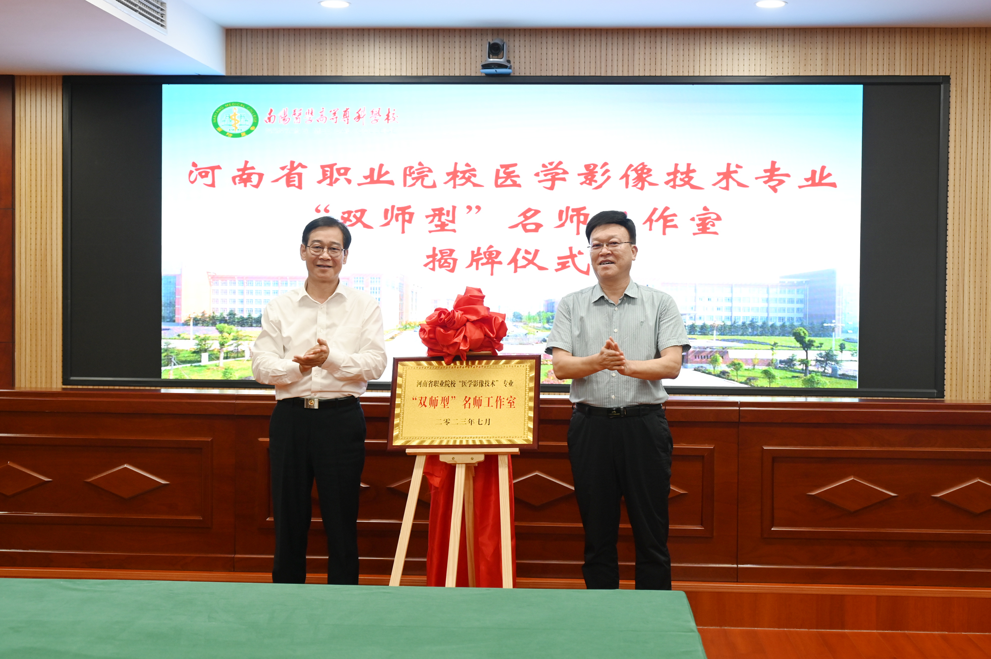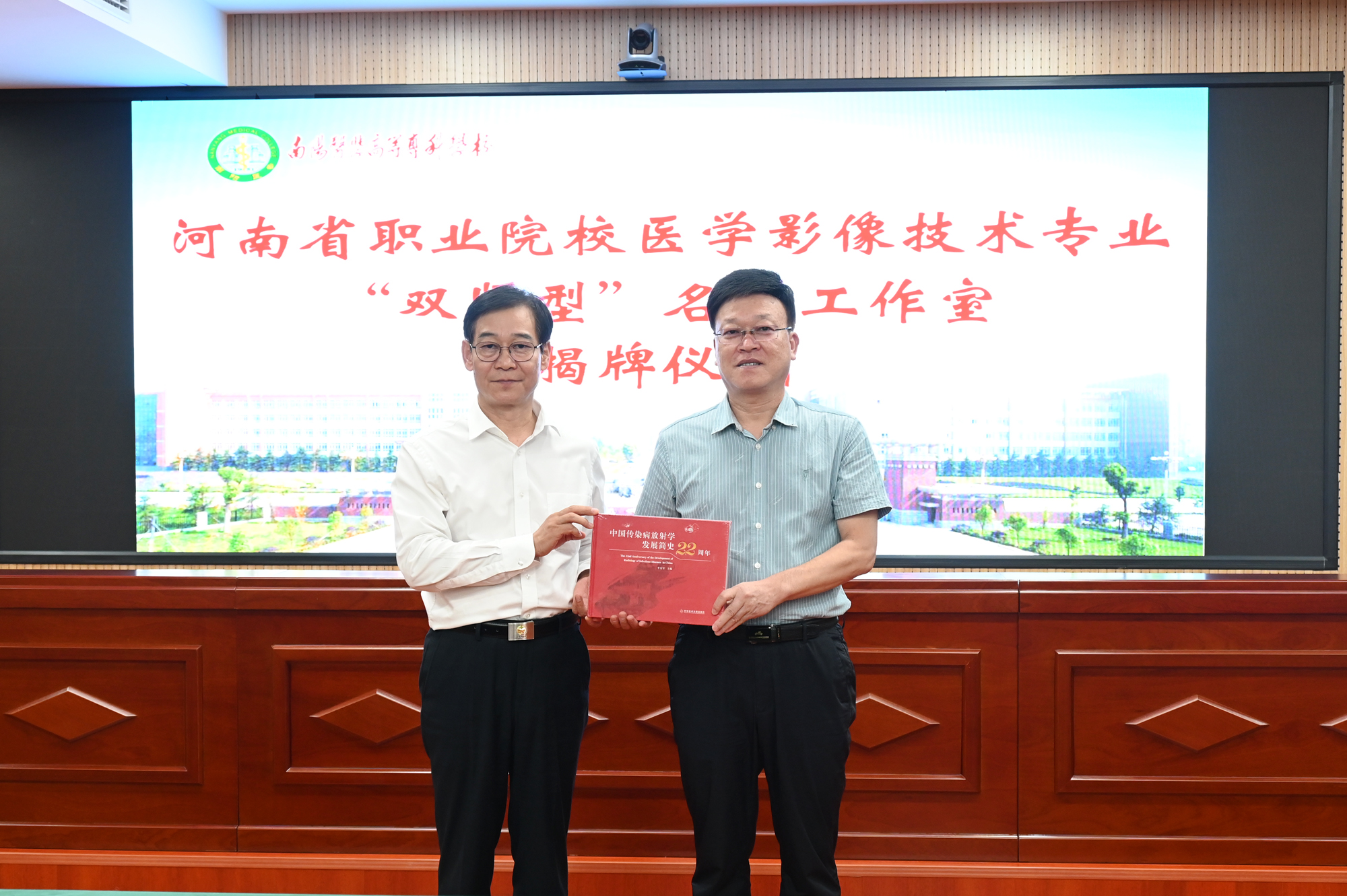 柳明伟和李宏军共同为“河南省职业院校医学影像技术专业‘双师型’名师工作室”揭牌。李宏军教授向我校赠送《中国传染病放射学发展简史(22周年)》纪念书册。