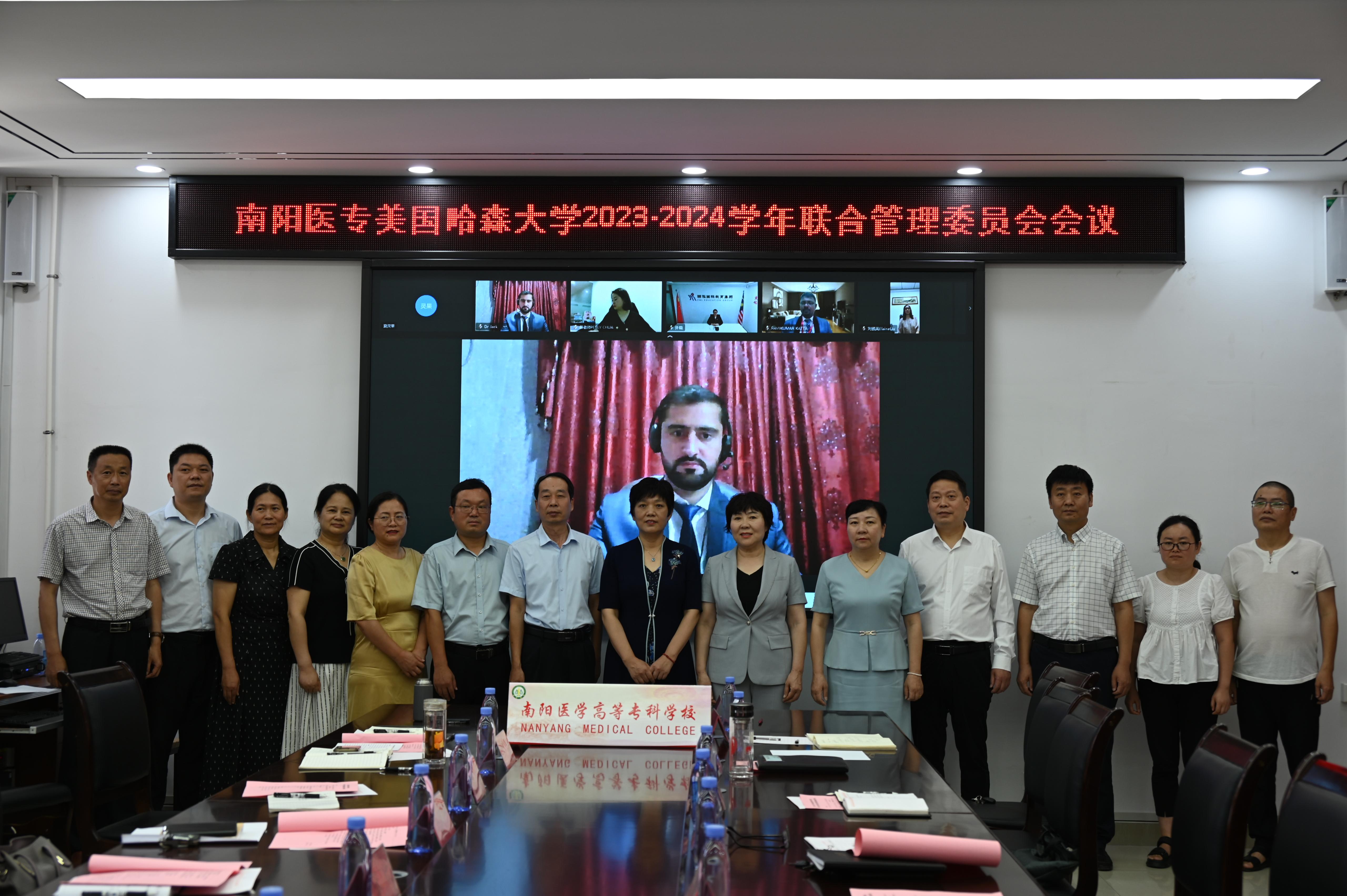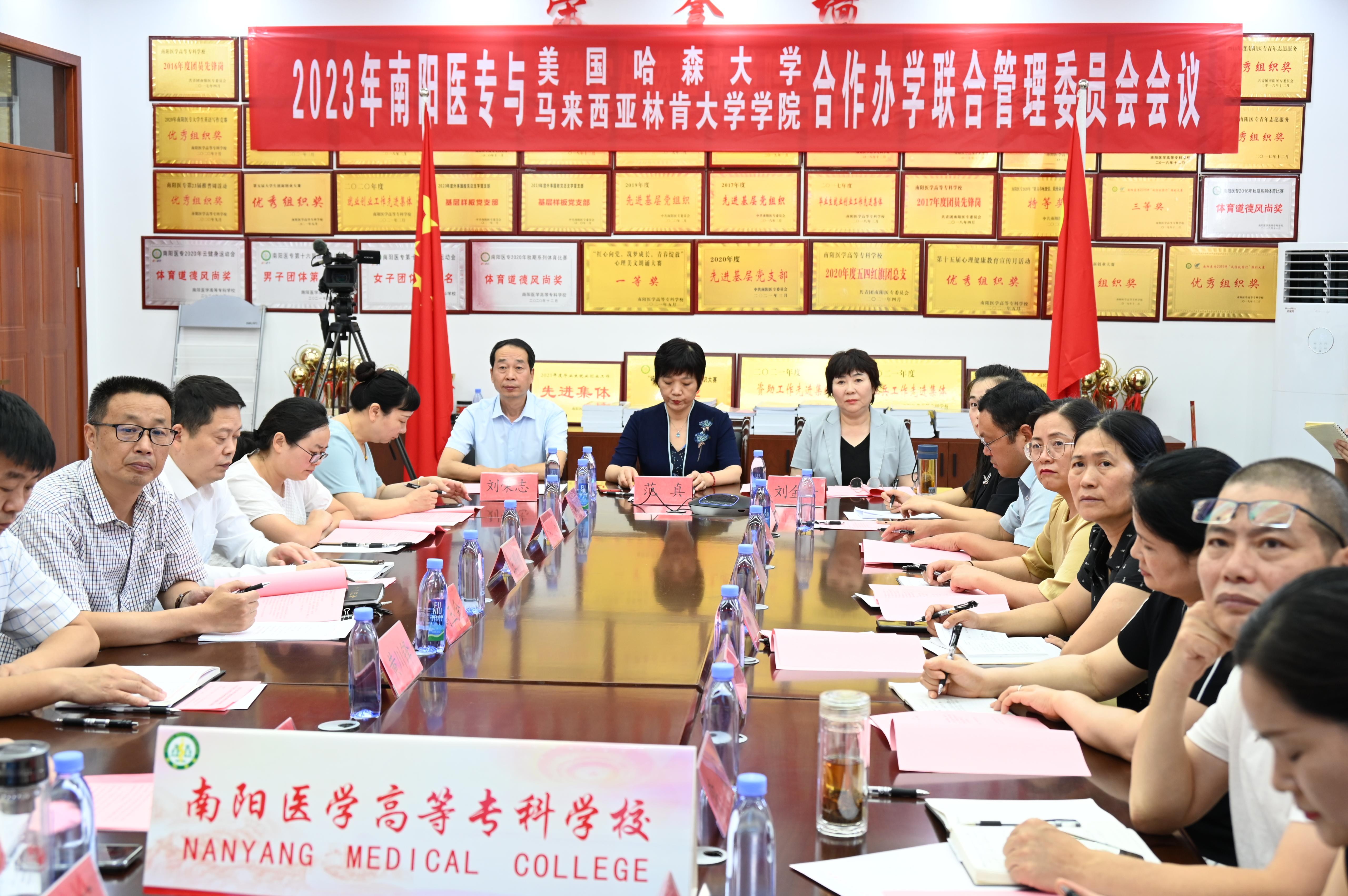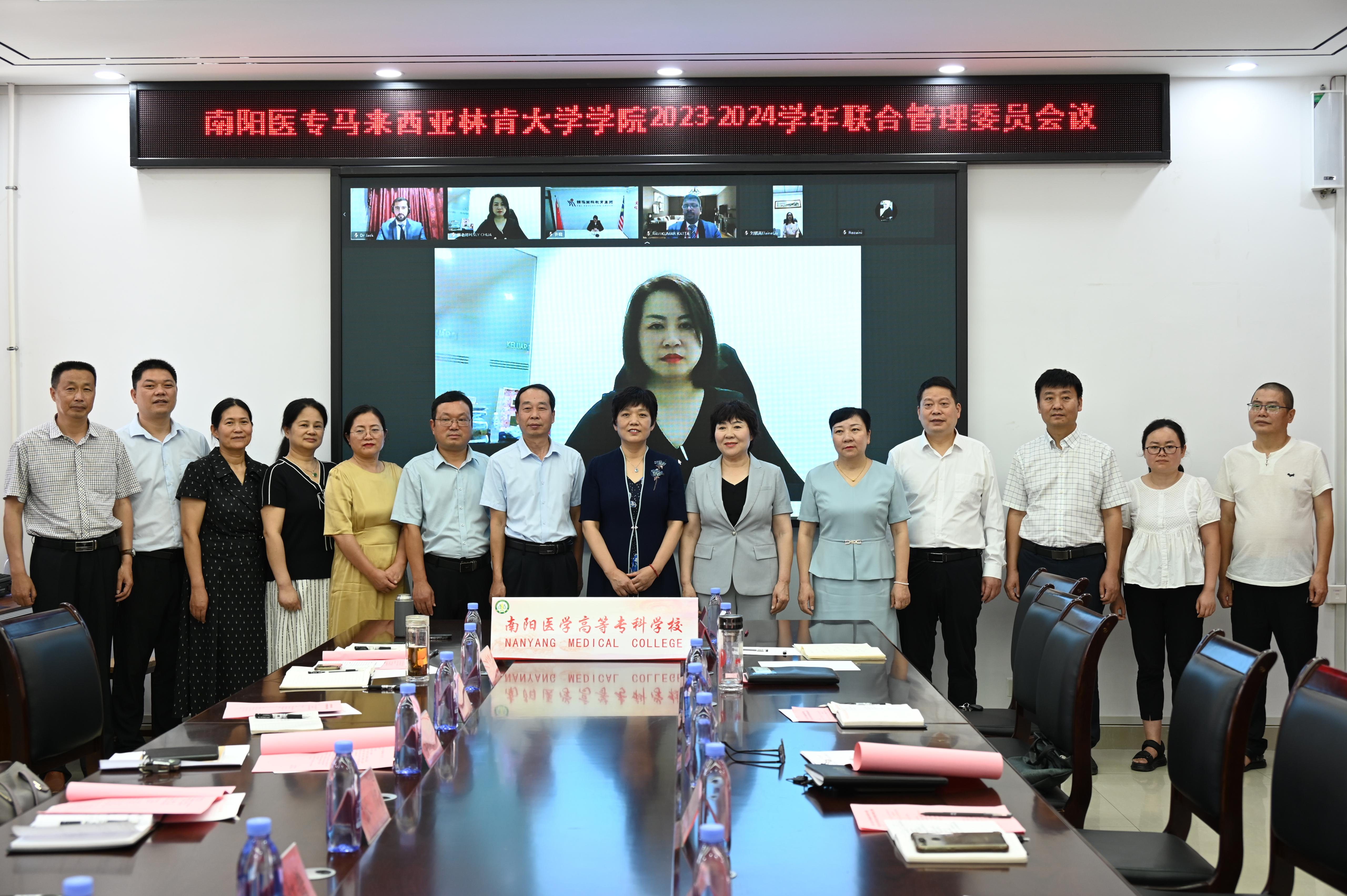 本网讯(文/外事处 夏灵果) 8月22日、23日,我校在仲景西区3号教学楼423会议室召开2023—2024学年中外合作办学联合管理委员会视频会议,校领导范真、刘荣志出席,马来西亚林肯大学学院校长拿督比和口腔医学院院长、美国哈森大学副校长琳恩及2个涉教部门主任,菲律宾伊密里欧学院校长康伯斯及3个涉学系部主任通过“钉钉”线上参会,我校党委宣传部、教务处、学生处、计财处、质管办、就业创业处、外事处、临床医学系、康复医学系、口腔医学系、药学系、医学技术系、护理系、国际教育学院负责人线下参会。校纪委书记刘金云主持会议。